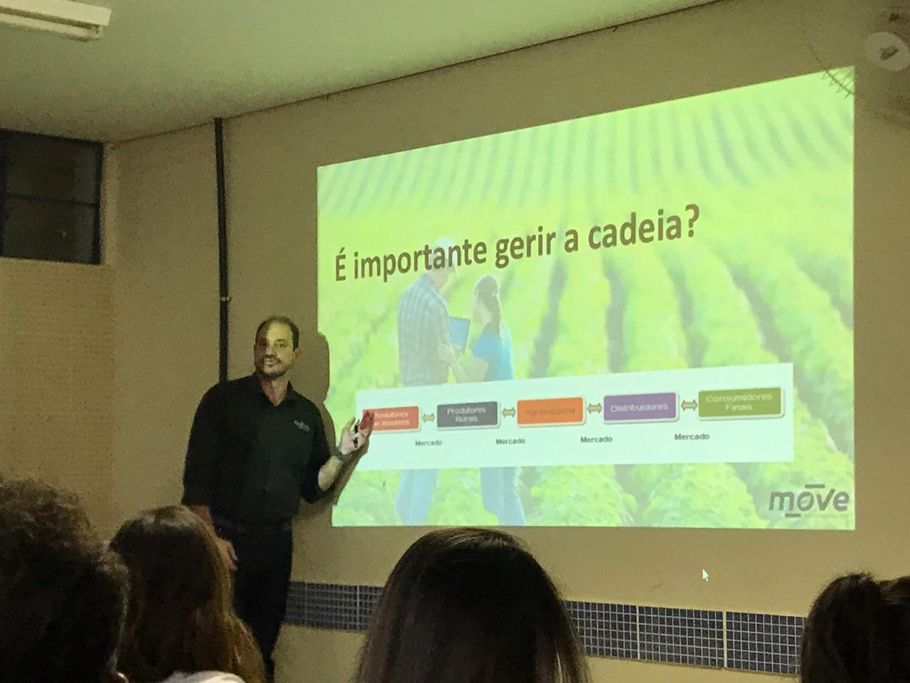 Wagner Santos, aluno do curso de Tecnologia em Agronegócio do Centro Universitário de Patos de Minas (UNIPAM) e diretor da Move Agronegócios, ministrou no mês de novembro, uma palestra na Semana Acadêmica de Engenharia Agronômica, realizada em Coromandel (MG).