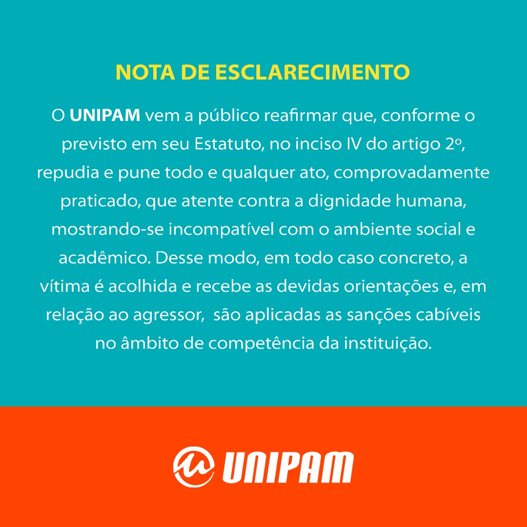 O UNIPAM vem a público reafirmar que, conforme o previsto em seu Estatuto, no inciso IV do artigo 2º, repudia e pune todo e qualquer ato, comprovadamente praticado, que atente contra a dignidade humana, mostrando-se incompatível com o ambiente social e acadêmico. Desse modo, em todo caso concreto, a vítima é acolhida e recebe as devidas orientações e, em relação ao agressor, são aplicadas as sanções cabíveis no âmbito de competência da instituição.