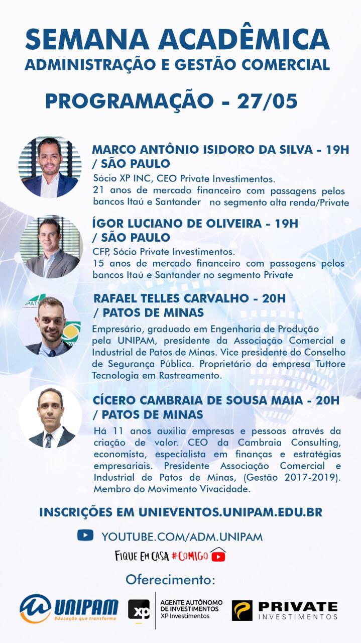 No primeiro dia do evento, 27 de maio (quarta-feira), ministrarão palestras: Marco Antônio Isidoro da Silva, sócio da XP Investimentos, CEO da Private Investimentos, com experiência de 21 anos no mercado financeiro; Ígor Luciano de Oliveira, Sócio da Private Investimentos, com experiência de 15 anos no mercado financeiro; Rafael Telles Carvalho, engenheiro de produção e proprietário da empresa Tuttore Tecnologia e Rastreamento; e Cícero Cambraia de Sousa Maia, CEO da Cambraia Consulting, economista e especialista em finanças e estratégias empresariais.