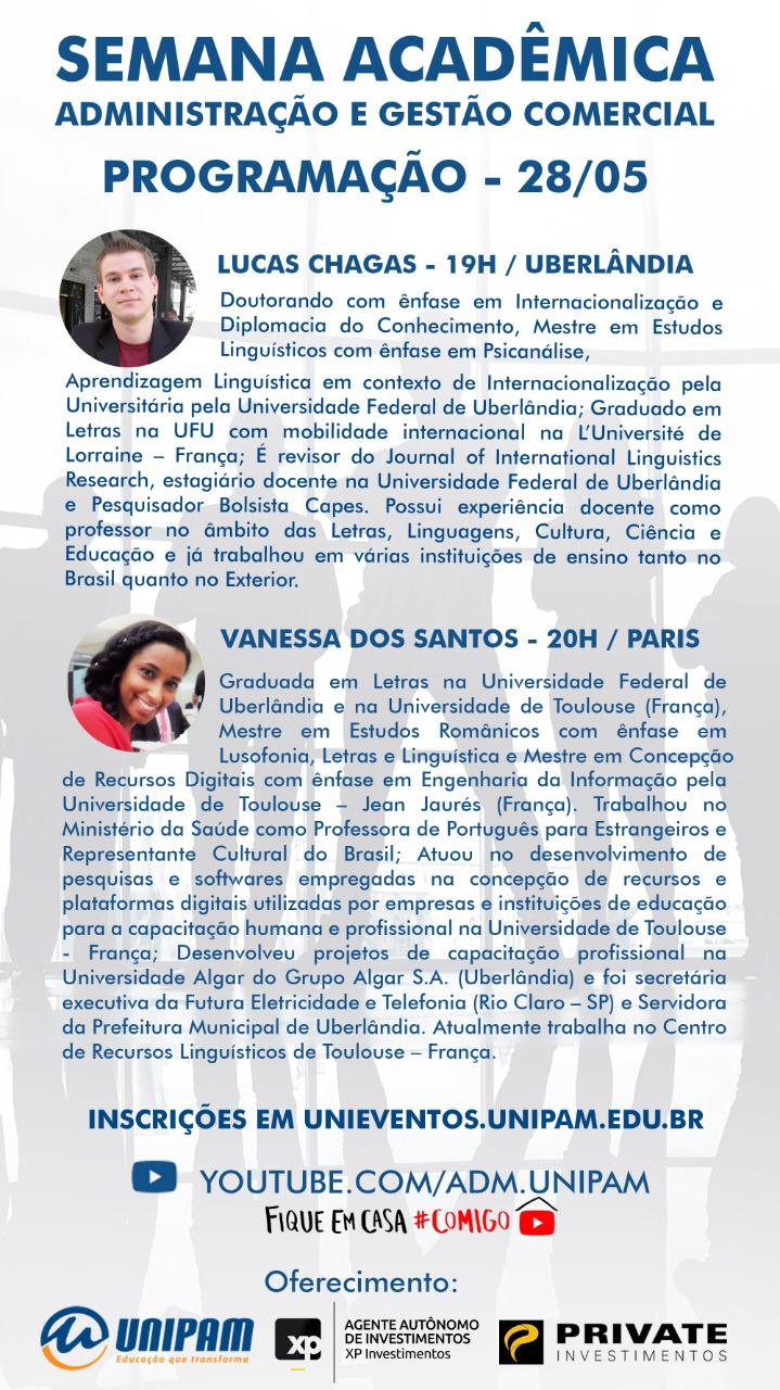 No segundo dia do evento, 28 de maio (quinta-feira), será a vez de Lucas Chagas, Doutorando com ênfase em Internacionalização e Diplomacia do Conhecimento e revisor do Journal of International Linguistics Research; e de Vanessa dos Santos, que é Mestre em Estudos Românicos, em Concepção de Recursos Digitais e atualmente trabalha no Centro de Recursos Linguísticos de Toulouse, na França.
