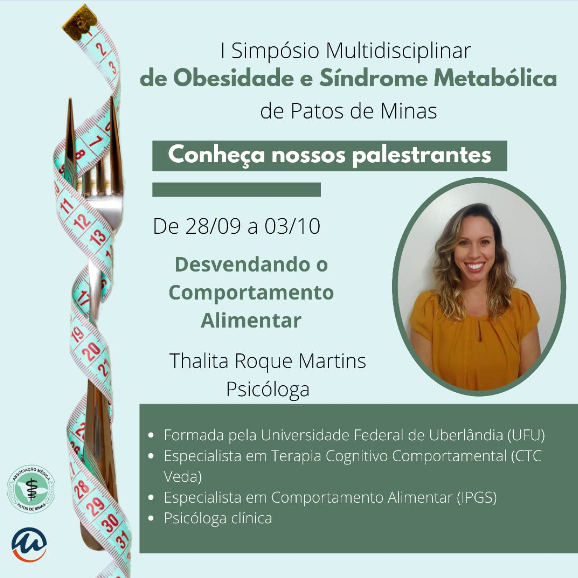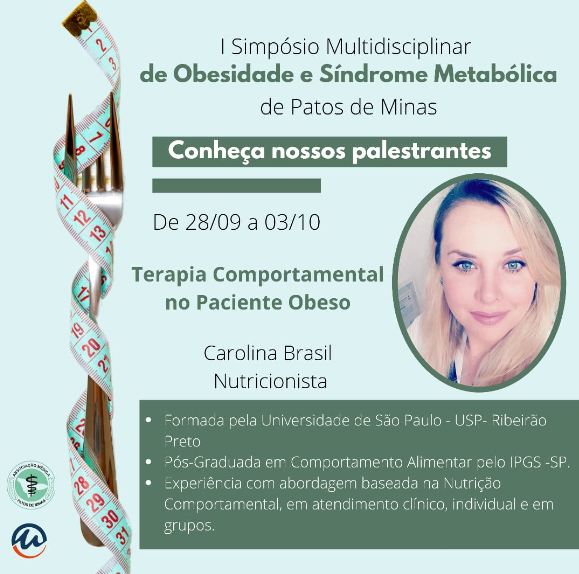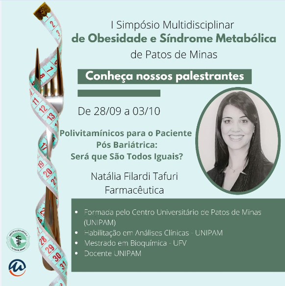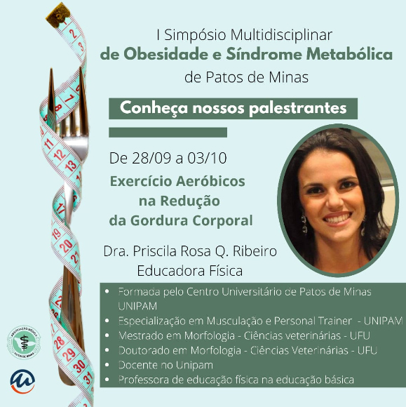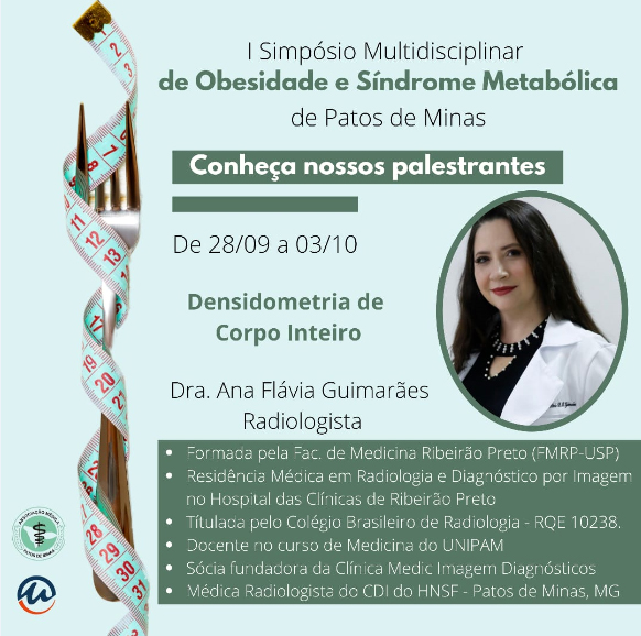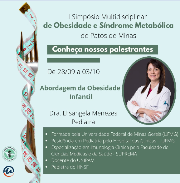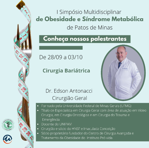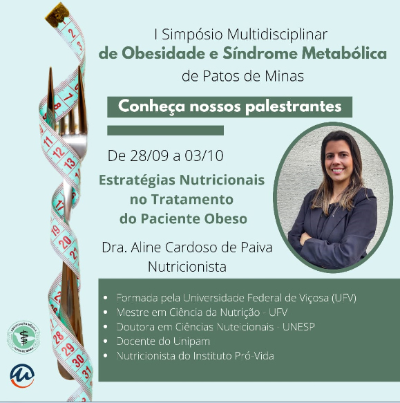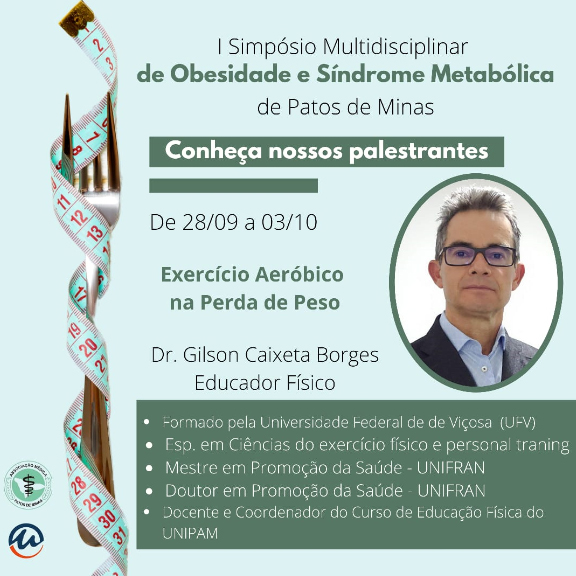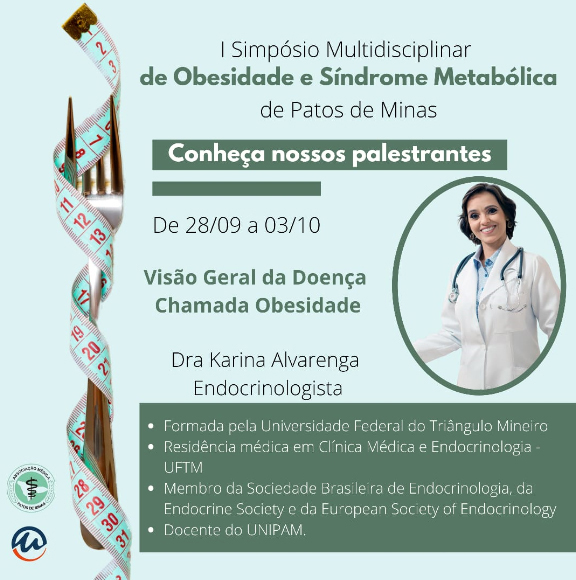 A Associação Médica Regional de Patos de Minas e o Centro Universitário de Patos de Minas (UNIPAM), promoverão de 28 de setembro a 03 de outubro, a partir das 18h30, o “I Simpósio Multidisciplinar de Obesidade e Síndrome Metabólica”. O evento será transmitido, por meio do Canal UNIPAM, no YouTube.