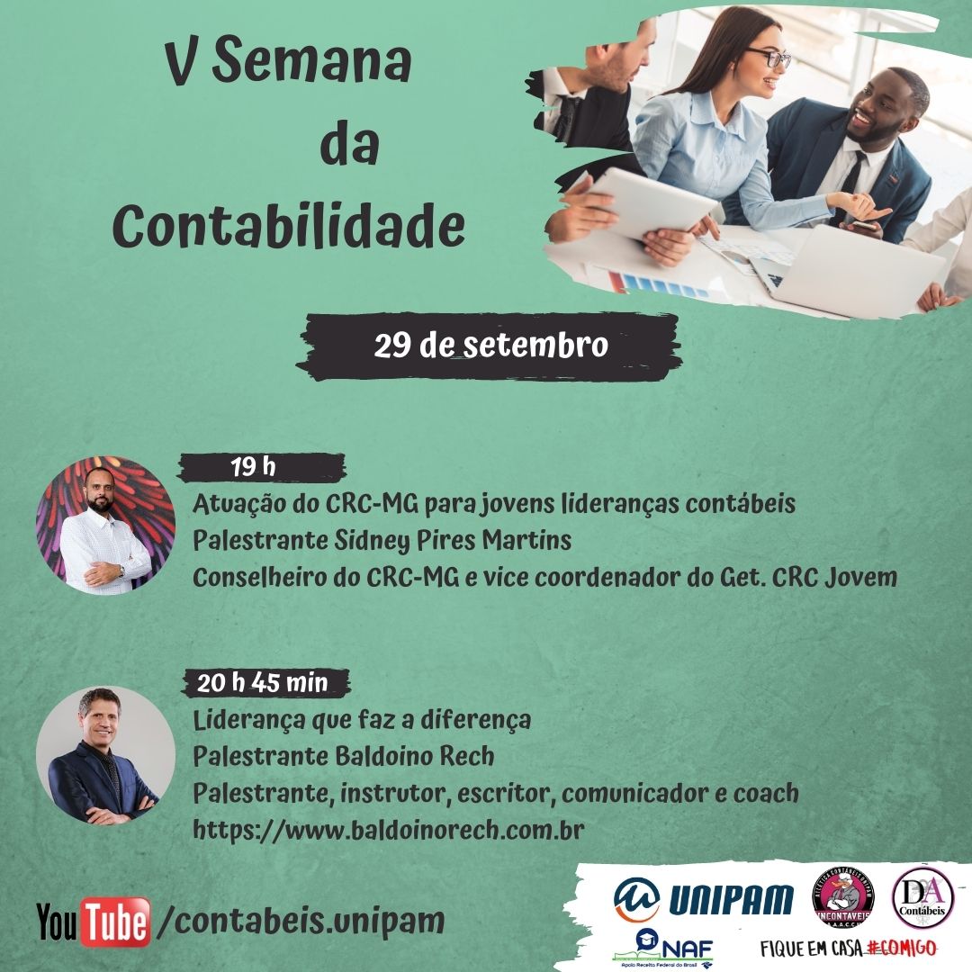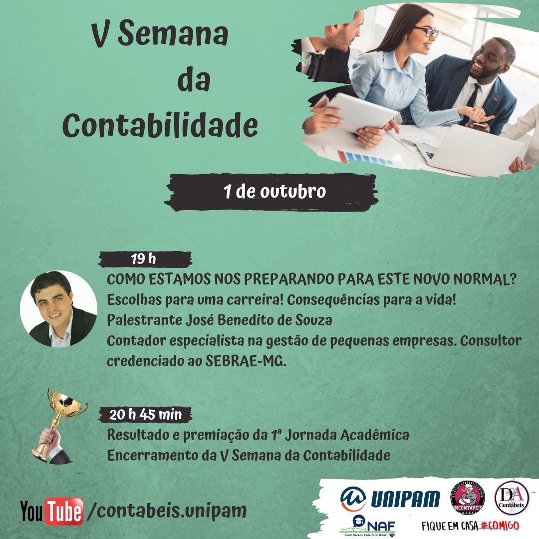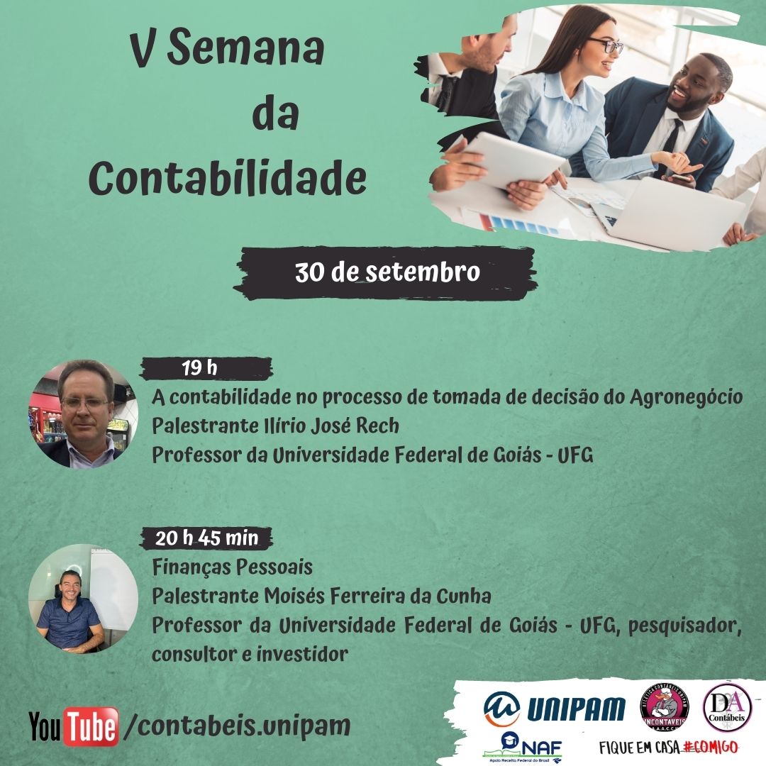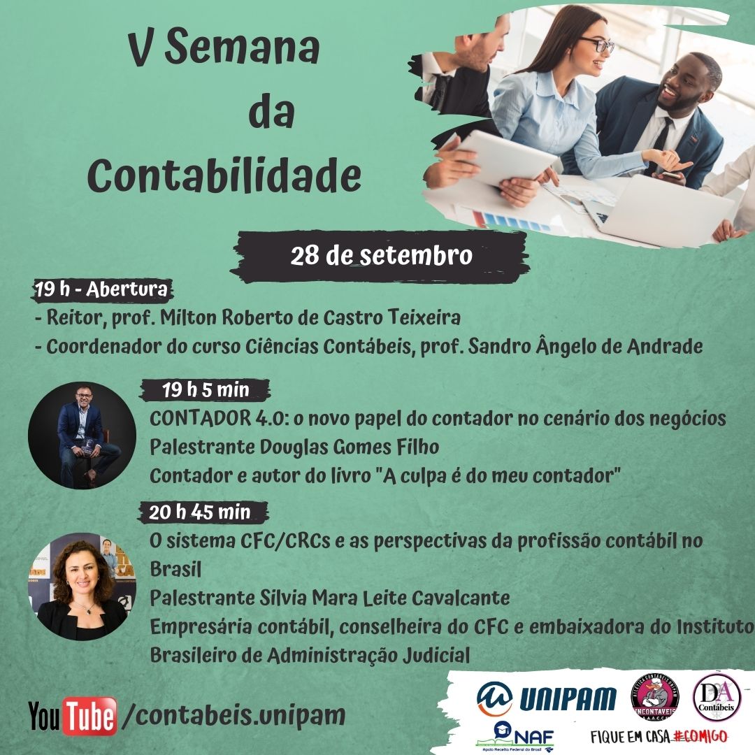 A coordenação do curso de Ciências Contábeis do Centro Universitário de Patos de Minas (UNIPAM) promoverá de 28 de setembro a 1º de outubro, a partir das 19h, a “V Semana da Contabilidade”. O evento será on-line, transmitido por meio do canal <http://youtube.com/contabeis.unipam>.