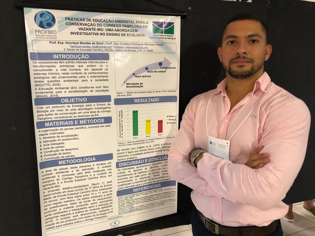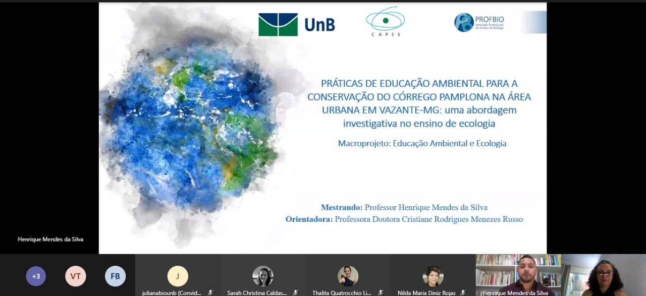 Na oportunidade o professor apresentou, por meio da plataforma Teams, sua dissertação intitulada “Práticas de Educação Ambiental para a conservação do córrego Pamplona em Vazante-MG: uma abordagem investigativa no Ensino de Ecologia”.