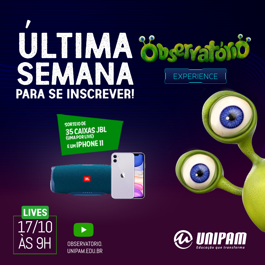 Estão abertas até esta sexta-feira (16), as inscrições para o Observatório Experience 2020, do Centro Universitário de Patos de Minas (UNIPAM). O evento acontece neste sábado (17), a partir das 9h, no formato de transmissão ao vivo. Os participantes concorrerão ao sorteio de 35 caixas de som JBL e a um iPhone 11.