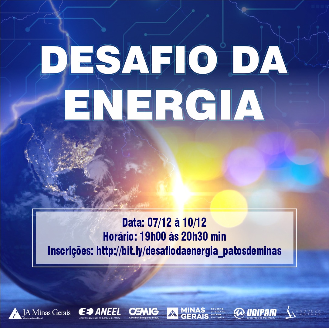 A Companhia Energética de Minas Gerais (CEMIG), em parceria com a Junior Achievement Minas Gerais (JAMG), promoverão de 07 a 10 de dezembro, das 19h às 20h30, em formato on-line, o “Desafio da Energia”. O evento contará com a participação de alunos do Centro Universitário de Patos de Minas (UNIPAM).