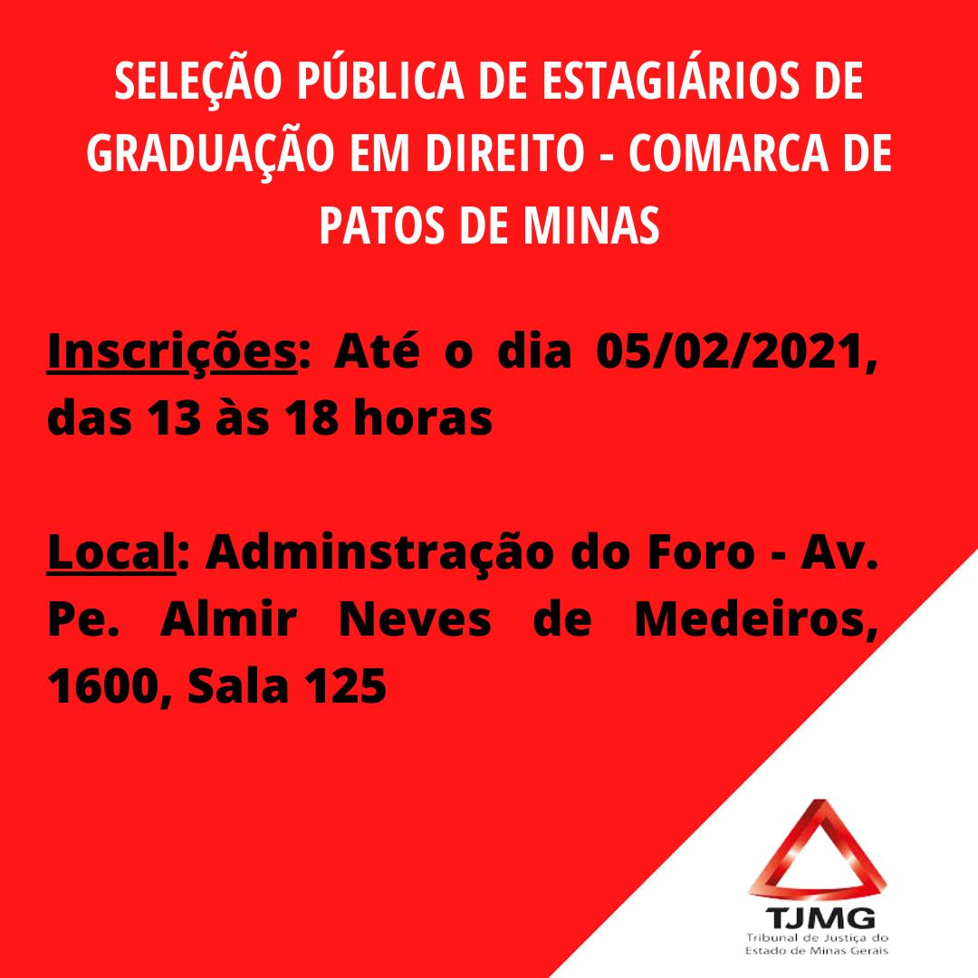 Estão abertas as inscrições para a seleção pública de estagiários do curso de graduação em Direito para o provimento de vagas nas Varas Cíveis, Varas Criminais e no Juizado Especial Cível e Criminal da Comarca de Patos de Minas do Estado de Minas Gerais.