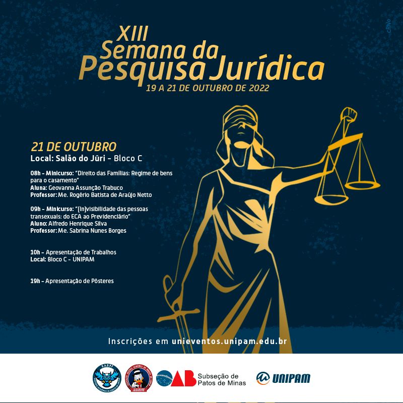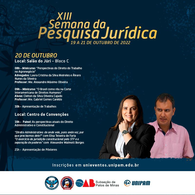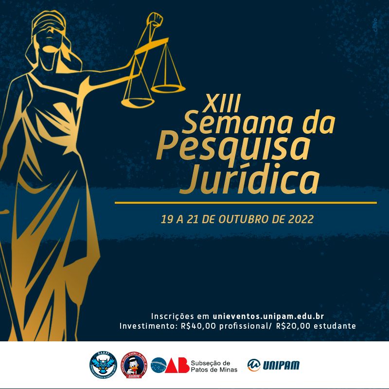 O curso de Direito, do Centro Universitário de Patos de Minas (UNIPAM), promoverá de 19 a 21 de outubro, no Salão do Júri e no Centro de Convenções e Eventos (CCE), a XIII Semana da Pesquisa Jurídica. O evento contará com palestras, com minicursos e com apresentações de pôsteres.