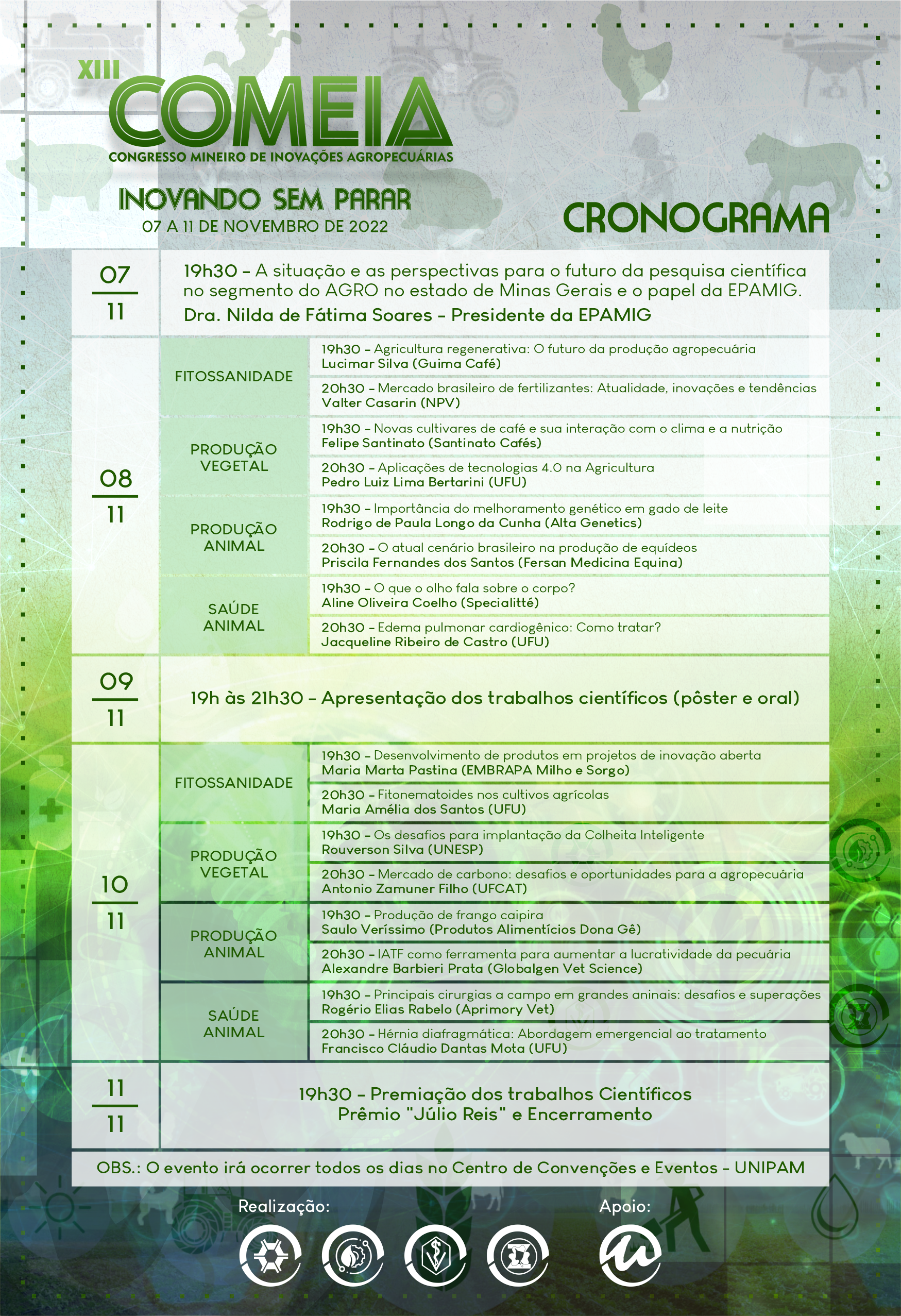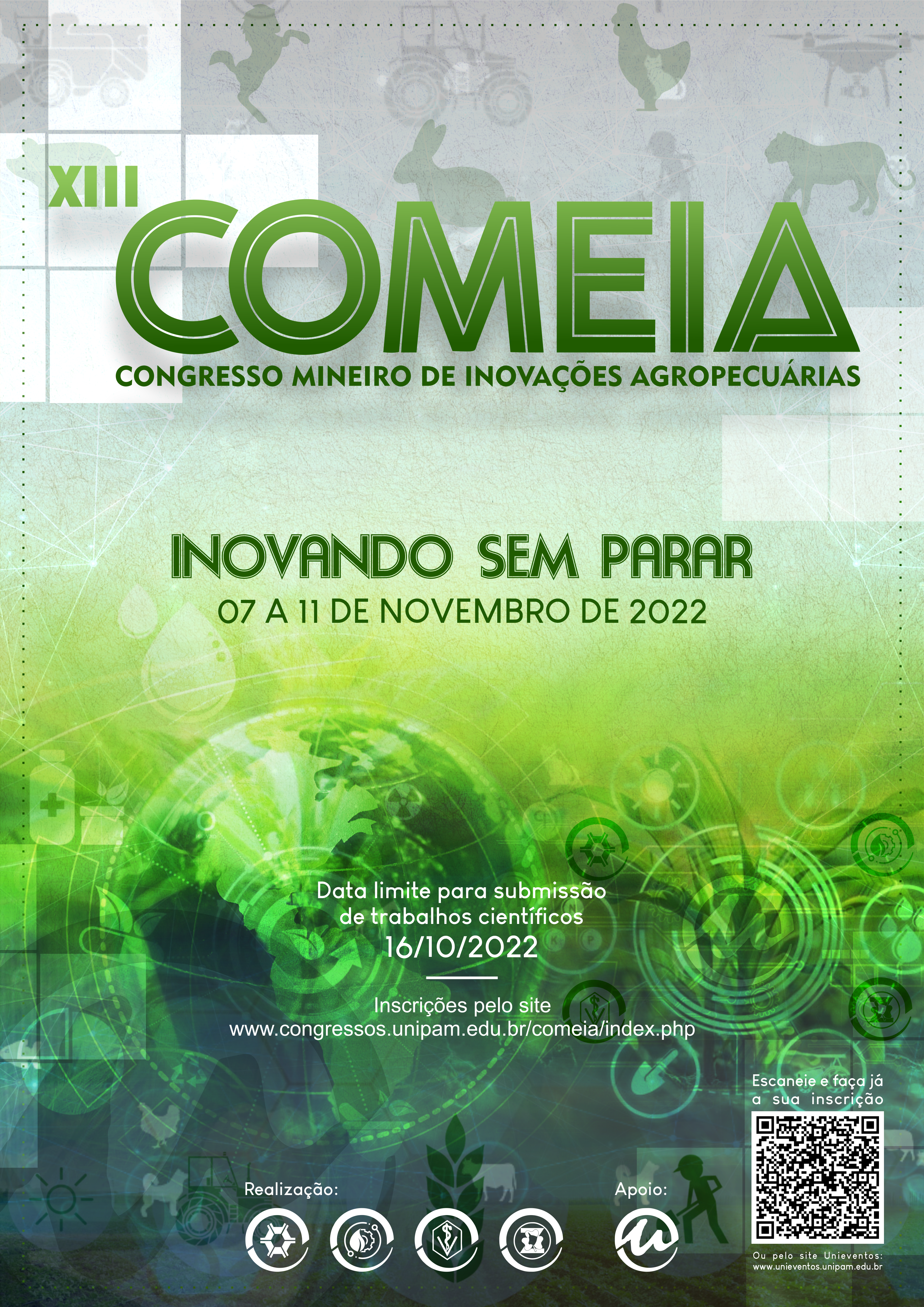 O Centro Universitário de Patos de Minas (UNIPAM) promoverá de 07 a 11 de novembro, no Centro de Convenções e Eventos (CCE), a XIII edição do Congresso Mineiro de Inovações Agropecuárias (COMEIA). Este ano, o evento tem como tema “Inovando sem Parar”. O congresso contará com palestras e com apresentações de trabalhos científicos.