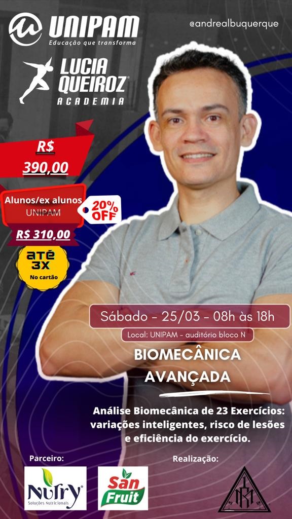 O ministrante será o profissional André Albuquerque que é mestre em Educação Física; diretor e proprietário da Biomekhane Biomecânica aplicada; autor do livro “Biomecânica Prática no Exercício Físico”; e sócio-proprietário do Instituto Brasileiro de Ensino em Biomecânica (IBRABI).