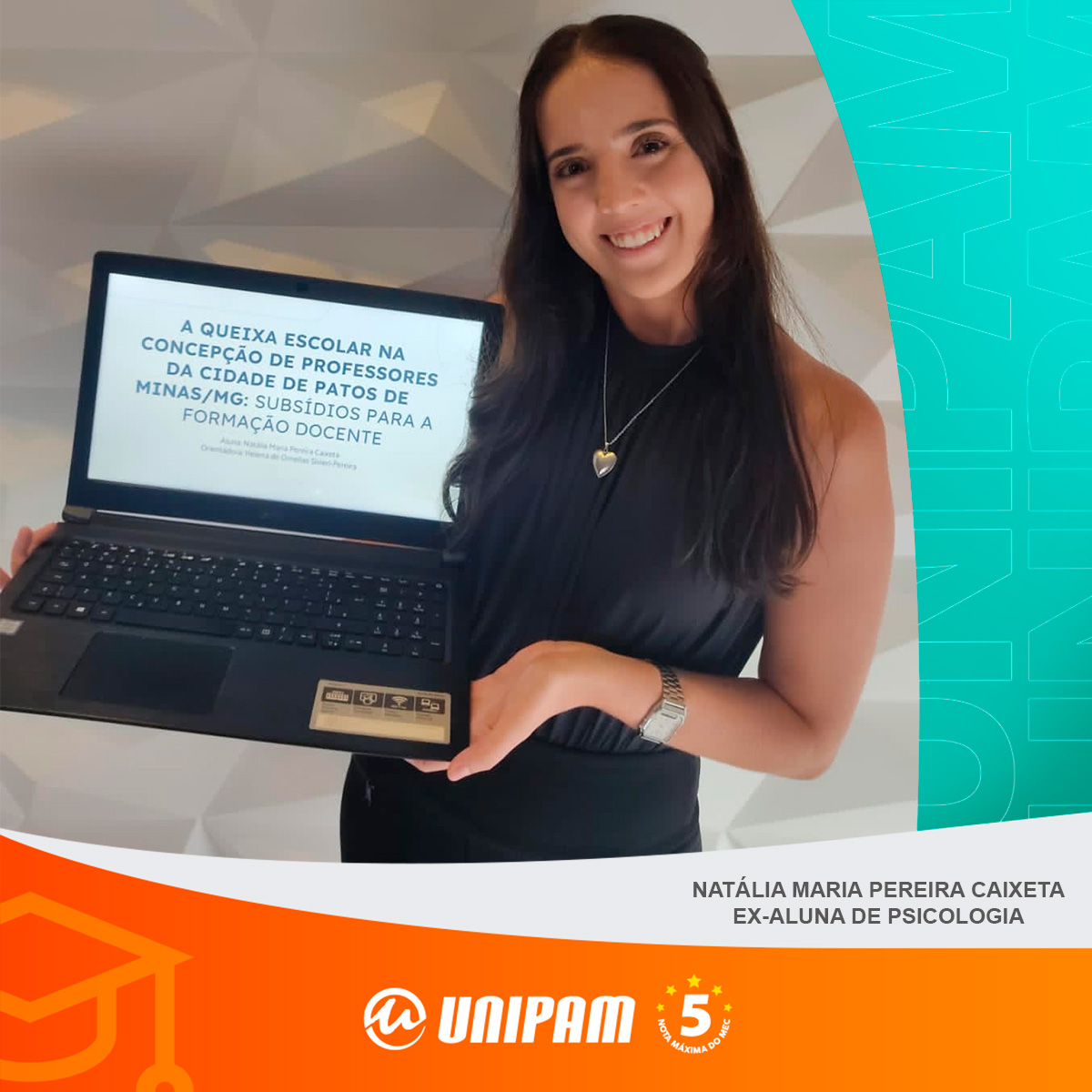 Natália Maria Pereira Caixeta, ex-aluna do curso de Psicologia do Centro Universitário de Patos de Minas (UNIPAM), concluiu recentemente o Programa de Mestrado em Educação, pela Universidade Federal do Triângulo Mineiro (UFTM).
