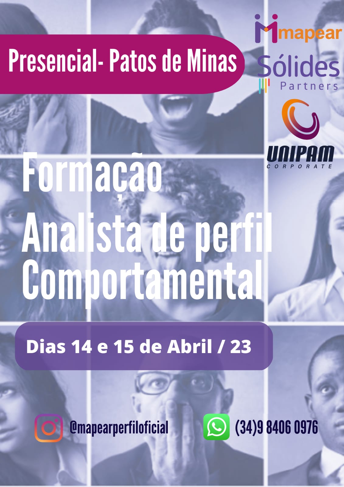 A Sólides Partners, a Mapear Perfil e o Centro Universitário de Patos de Minas (UNIPAM), por meio do Programa UNIPAM Corporate, promoverão nos dias 14 e 15 de abril, na sala 302 do bloco I, a formação “Analista de Perfil Comportamental Profiler”.