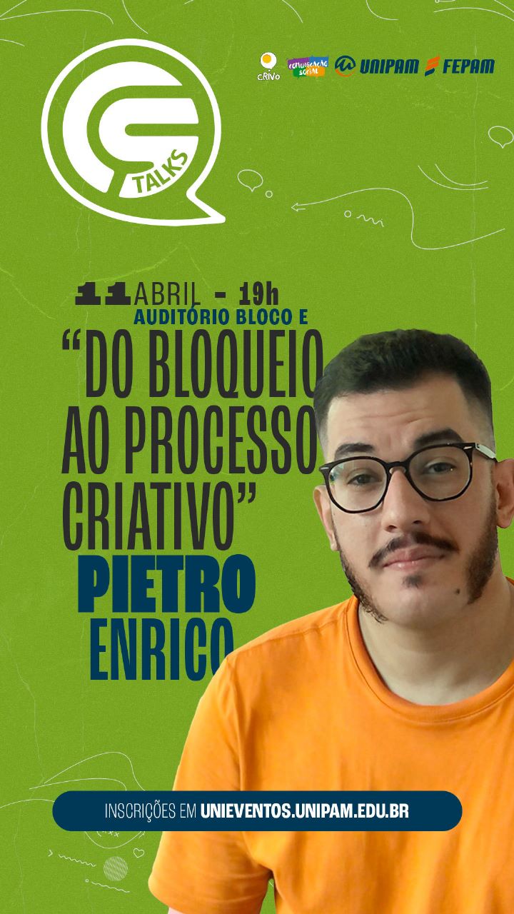 O curso de Publicidade e Propaganda, do Centro Universitário de Patos de Minas (UNIPAM), promove hoje (11), às 19h, no auditório do Bloco E, mais uma edição do CS Talks. O convidado é o publicitário Pietro Enrico, que ministrará sobre o tema “Do Bloqueio ao Processo Criativo”.