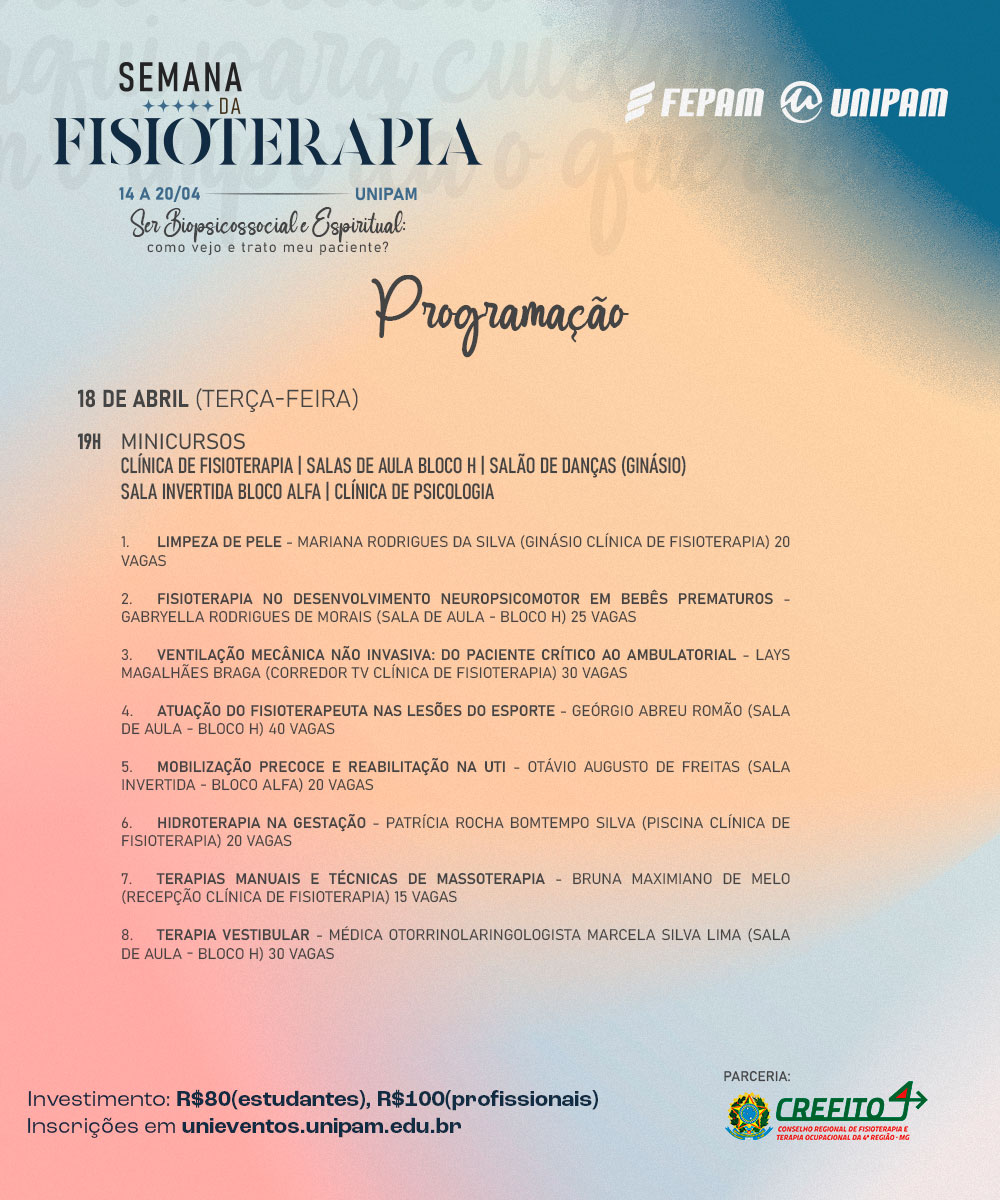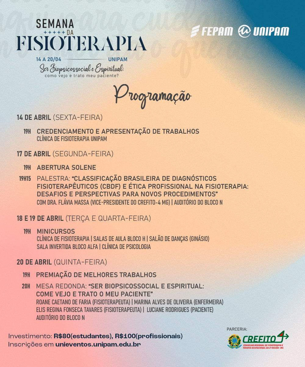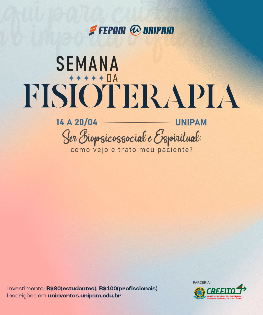 O curso de Fisioterapia do Centro Universitário de Patos de Minas (UNIPAM) promove, de 14 a 20 de abril, a Semana da Fisioterapia. Este ano, o evento tem como tema “Ser Biopsicossocial e Espiritual: Como Vejo e Trato o meu Paciente?”.
