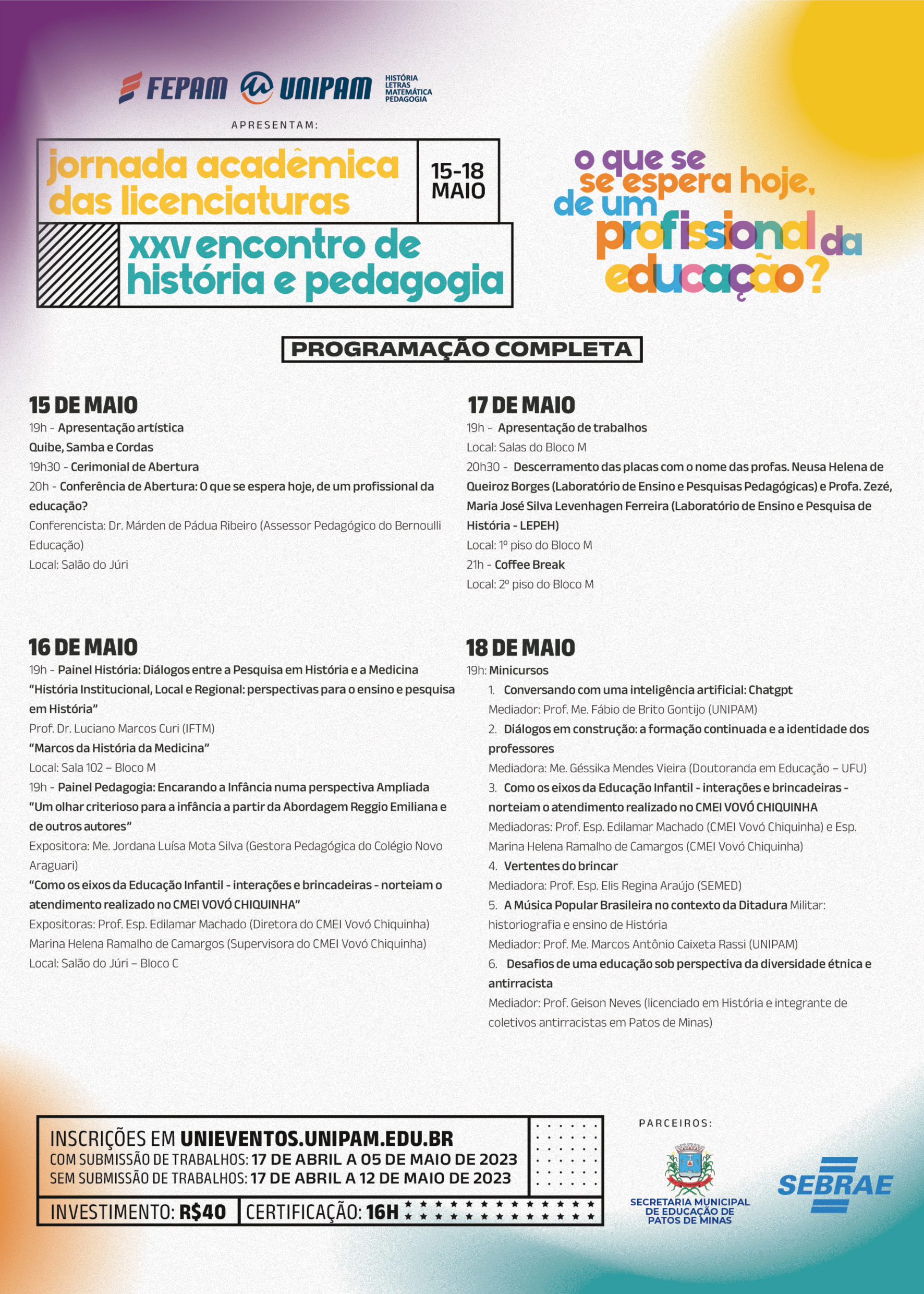 O Centro Universitário de Patos de Minas (UNIPAM) promoverá, de 15 a 18 de maio, a Jornada Acadêmica das Licenciaturas e o XXV Encontro de História e Pedagogia. Na oportunidade será abordado o tema “O que se espera hoje, de um profissional da educação?”.