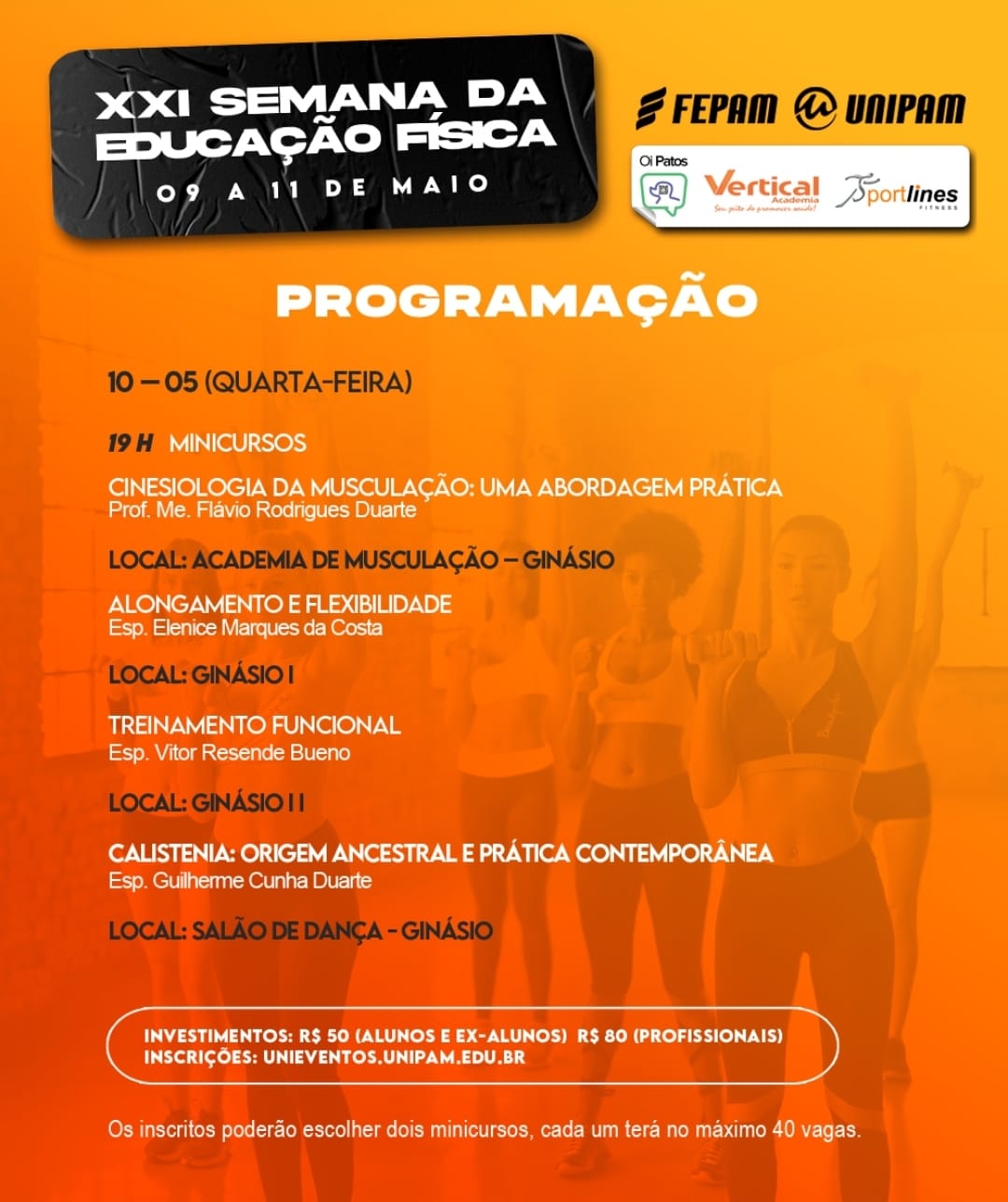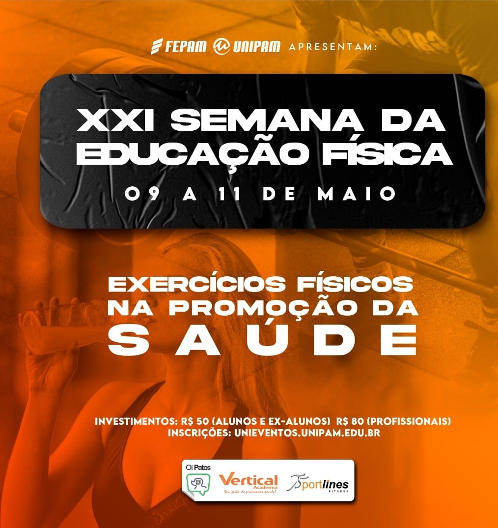 O Centro Universitário de Patos de Minas (UNIPAM) promoverá, de 09 a 11 de maio, a XXI Semana da Educação Física. O evento tem como tema “Exercícios Físicos na Promoção da Saúde”.