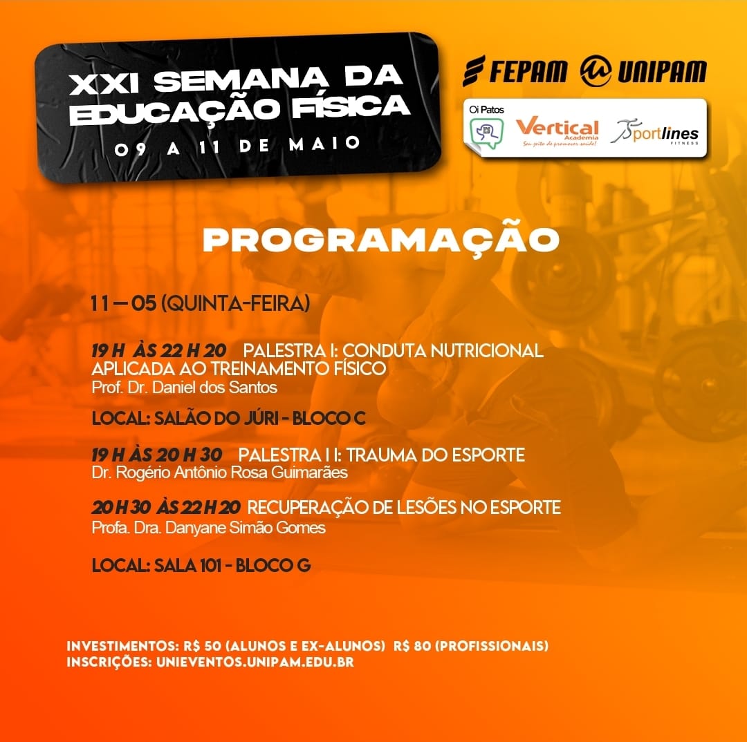No último dia, 11 de maio (quinta-feira), às 19h, no Salão do Júri, será ministrada a palestra “Conduta Nutricional Aplicada ao Treinamento Físico”, com Daniel dos Santos; Simultaneamente, na sala 101 do bloco G, ocorrerá a palestra “Trauma do Esporte”, com Rogério Rosa. Para encerrar, às 20h30, também na sala 101 do bloco G, será proferida a palestra “Recuperação de Lesões no Esporte”, com Danyane Simão Gomes.