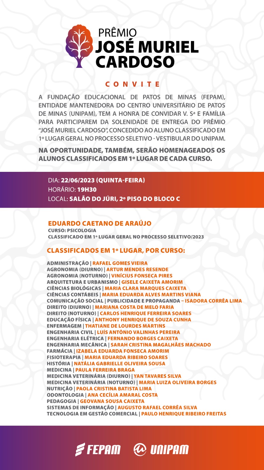 A Fundação Educacional de Patos de Minas (FEPAM) e o Centro Universitário de Patos de Minas (UNIPAM) realizarão, amanhã (22), às 19h30, no Salão do Júri, a solenidade de entrega do “Prêmio José Muriel Cardoso”.