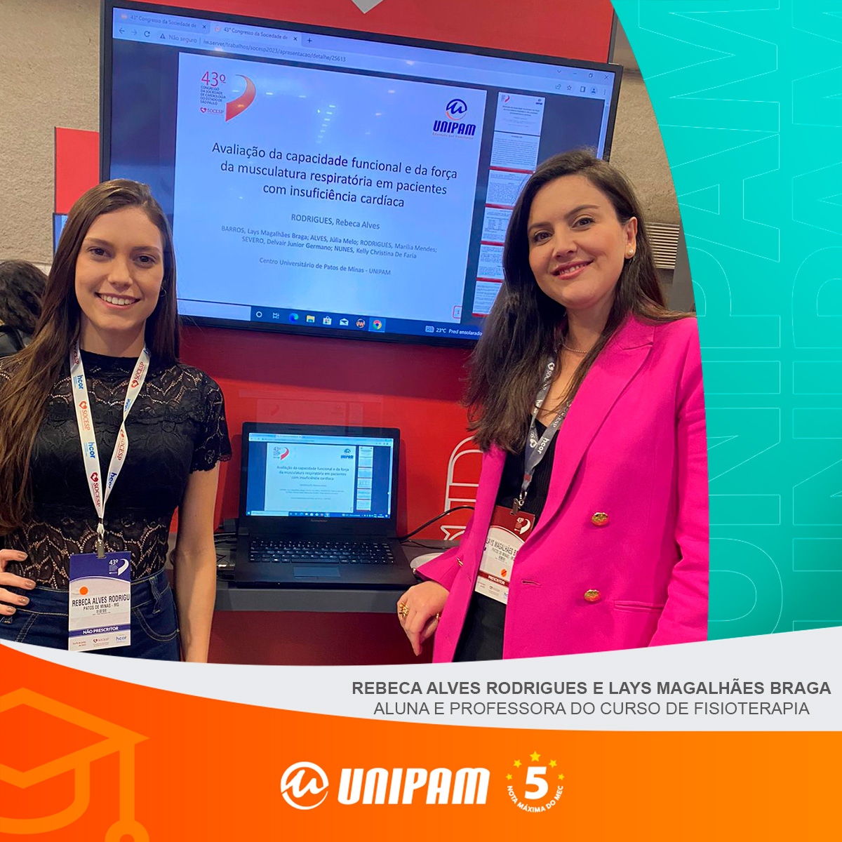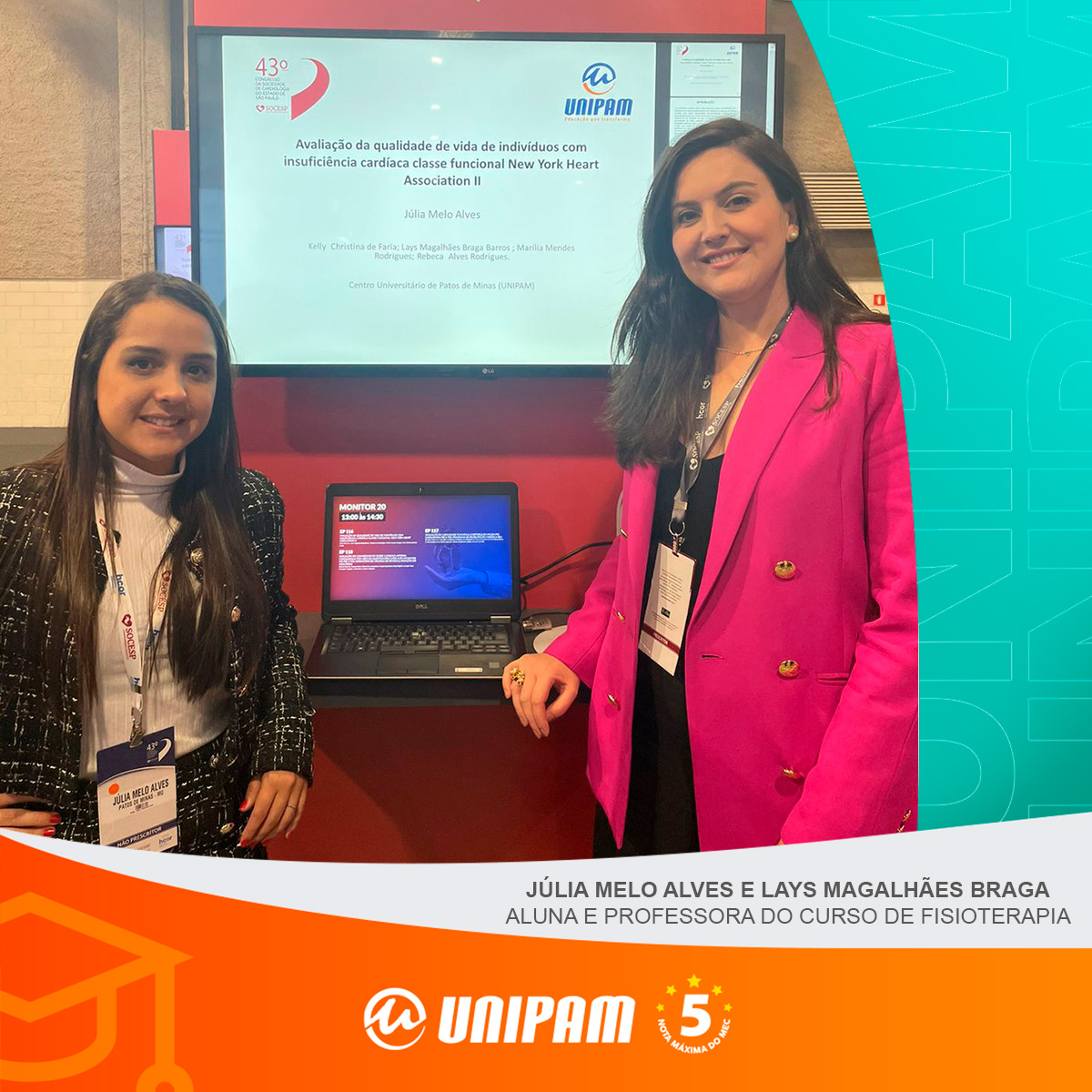Júlia Melo Alves e Rebeca Alves Rodrigues, alunas do curso de Fisioterapia do Centro Universitário de Patos de Minas (UNIPAM), acompanhadas pela professora Lays Magalhães Braga, participaram, no último semestre, do 43º Congresso da Sociedade de Cardiologia do Estado de São Paulo, promovido no Transamérica Expo Center, em São Paulo (SP).