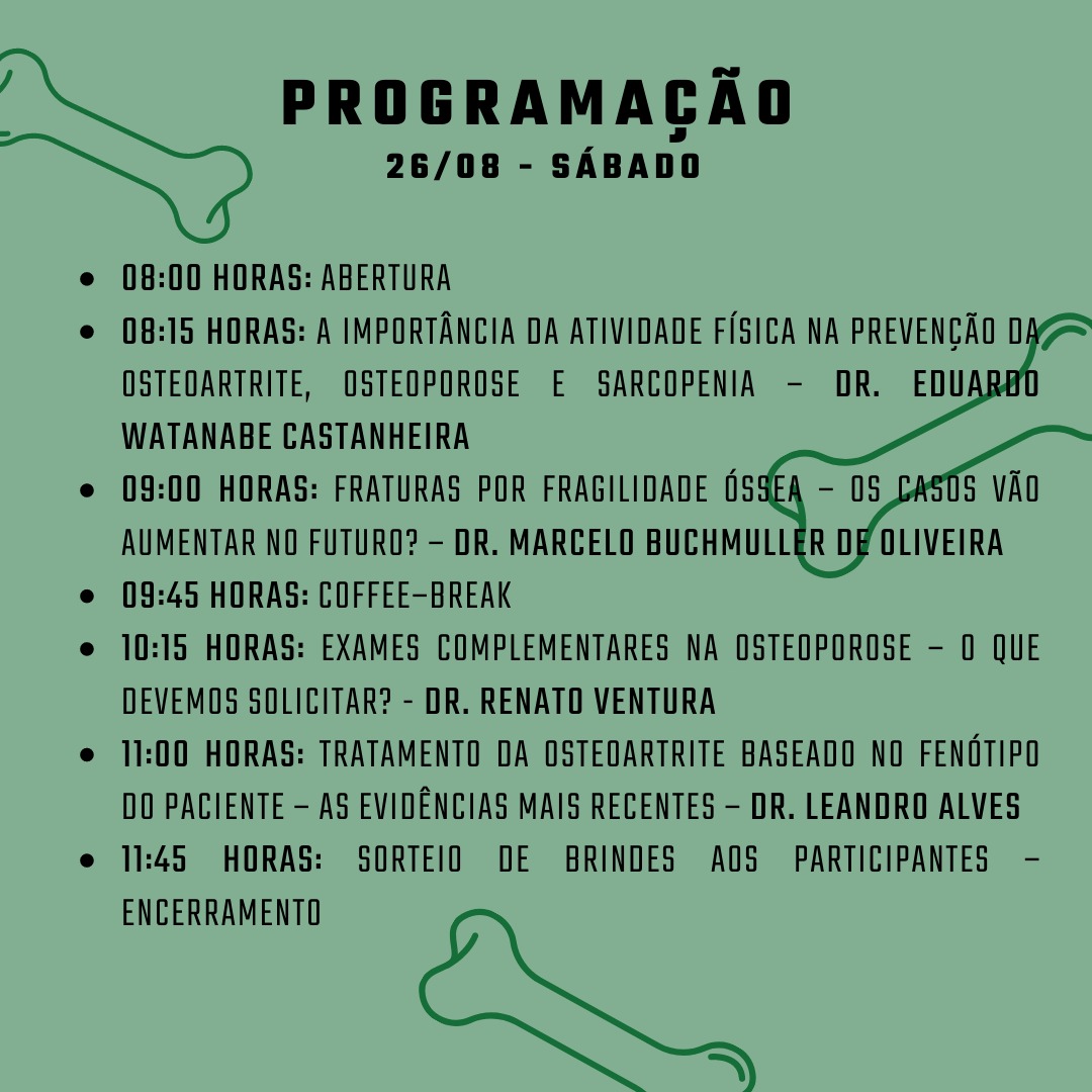 A JOMETRO é voltada para todos os cursos da área da saúde. Na oportunidade, será abordado o tema “Doenças Osteometabólicas”.