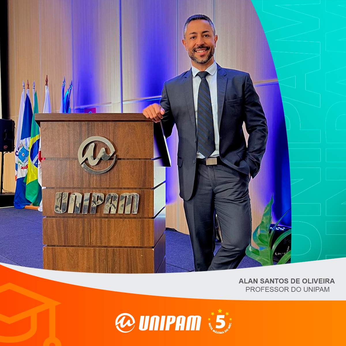 O professor Alan Santos de Oliveira é docente do UNIPAM desde o ano de 2006, lecionando em cursos de graduação e atuando, também, como Secretário-Geral e Ouvidor-Geral do UNIPAM. Sobre sua formação acadêmica, o professor Alan Santos de Oliveira possui Mestrado em Educação pela Universidade de Uberaba (UNIUBE), Graduação em Ciência Política e em Relações Internacionais pelo Centro Universitário Internacional (UNINTER) e em Secretariado Executivo pela União Pioneira de Integração Social (UPIS/DF), tendo obtido nesta mesma instituição o título de MBA em Comunicação Institucional.