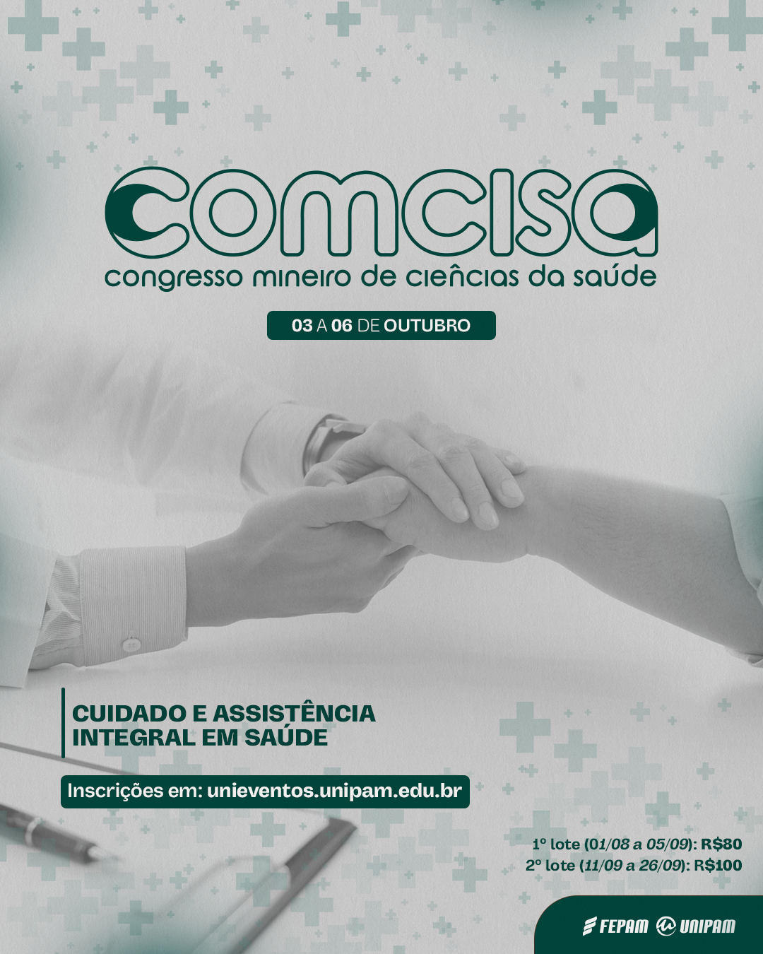 Os cursos da área da saúde do Centro Universitário de Patos de Minas (UNIPAM) promovem, de 03 a 06 de outubro, no Centro de Convenções e Eventos (CCE), o Congresso Mineiro de Ciências da Saúde (COMCISA). Este ano, o evento tem como tema “Cuidado e Assistência Integral em Saúde”.