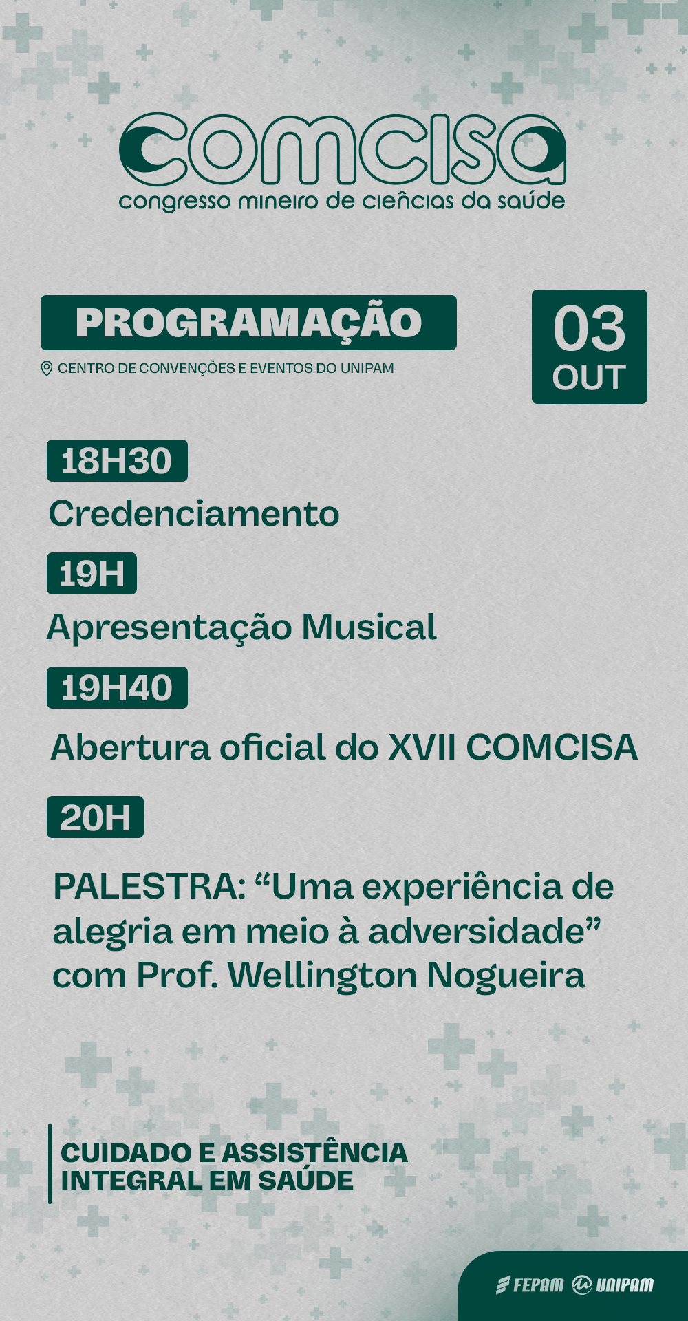 No primeiro dia, 03 de outubro (terça-feira), às 19h40, haverá a abertura oficial do evento. Posteriormente, às 20h, será ministrada a palestra “Uma experiência de alegria em meio à adversidade”, com o professor Wellington Nogueira.
