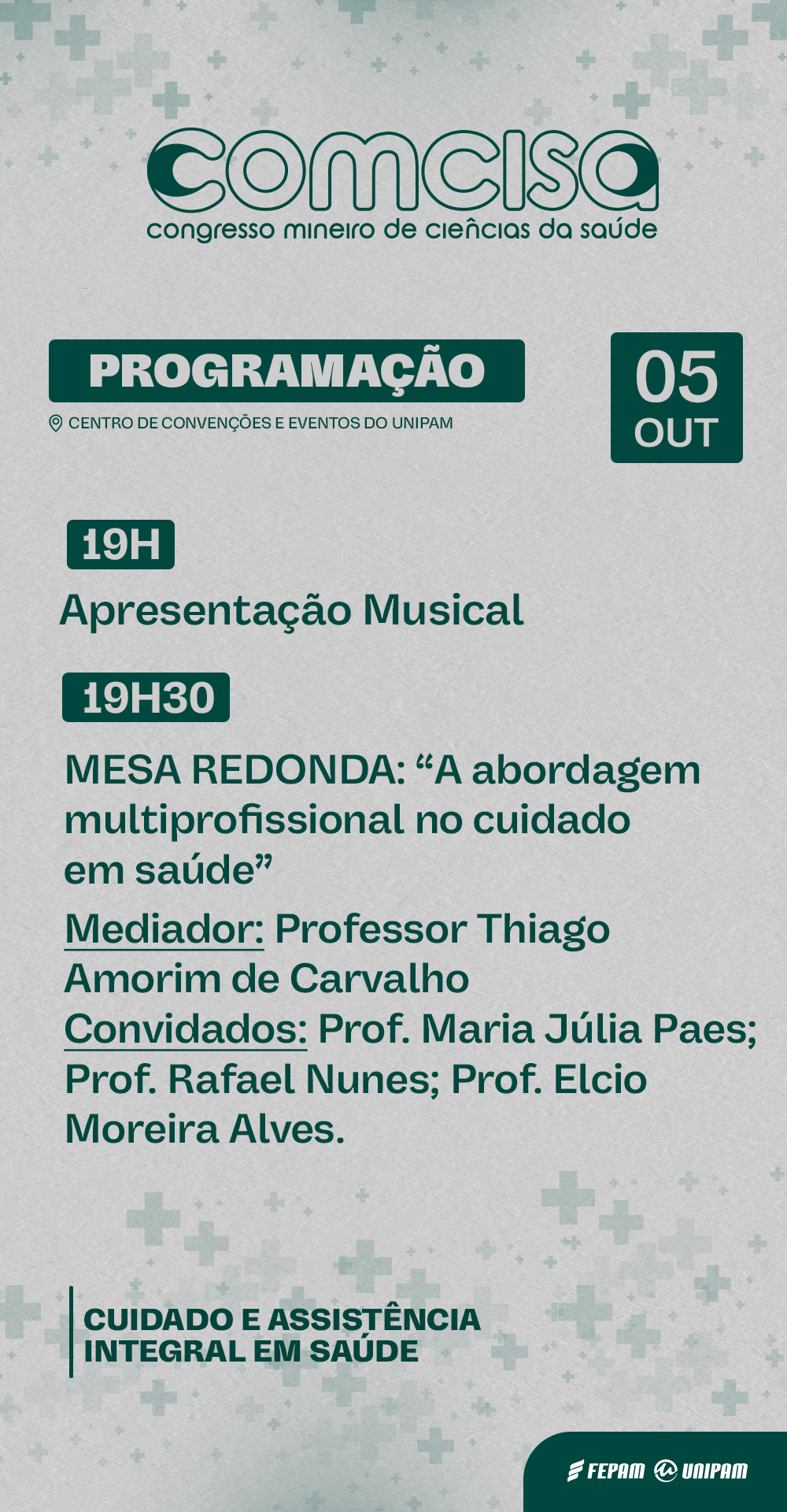 No terceiro dia, 05 de outubro (quinta-feira), às 19h30, ocorrerá a mesa-redonda “A abordagem multiprofissional no cuidado em saúde”, com os professores Elcio Moreira, Maria Júlia Paes e Rafael Nunes. O mediador será o professor Thiago Amorim.