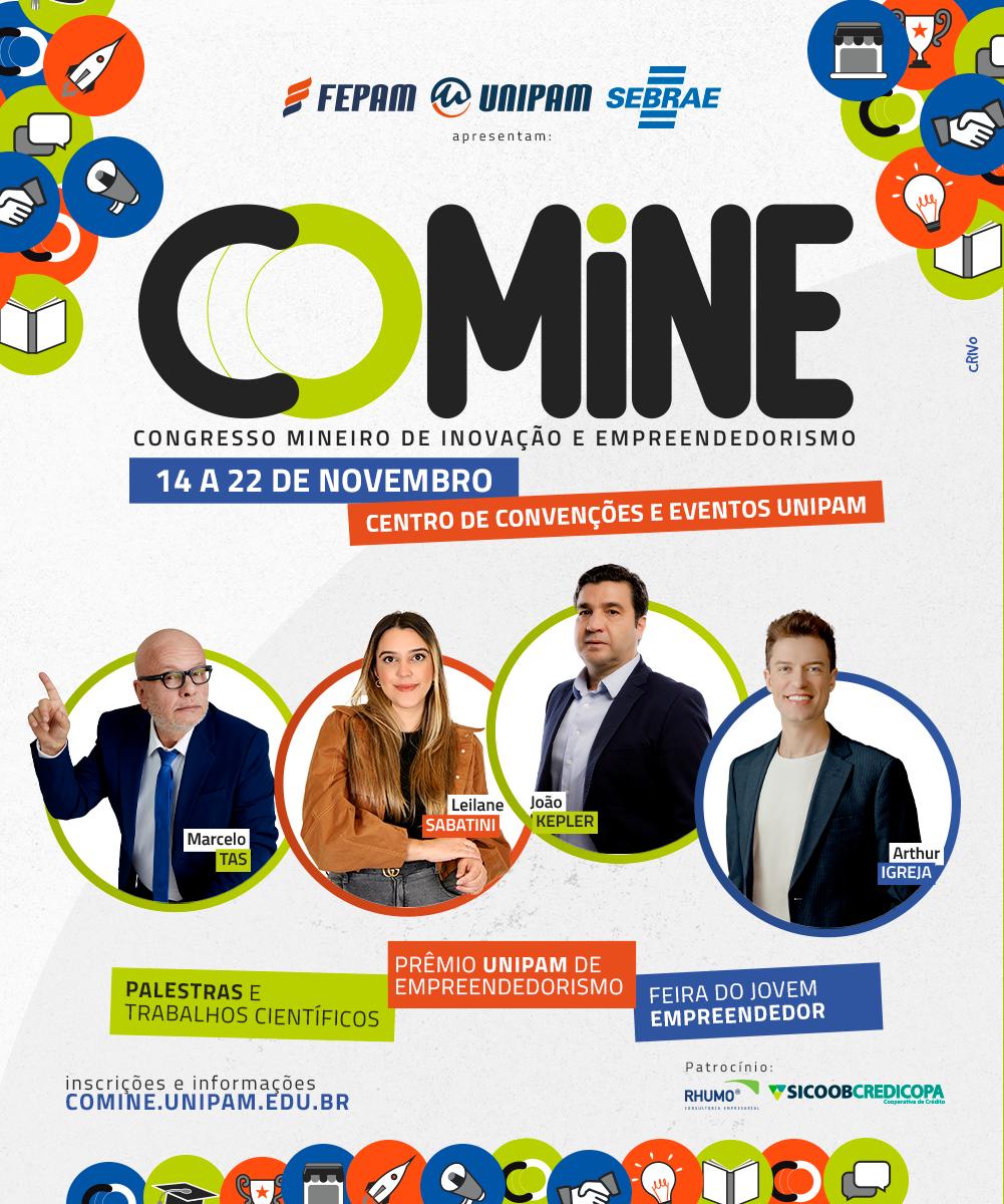 Foram confirmados, nesta semana, os quatro palestrantes que estarão no palco do 18º Congresso Mineiro de Inovação e Empreendedorismo (COMINE), que será promovido de 14 a 22 de novembro, no Centro de Convenções e Eventos (CCE). Marcelo Tas, Leilane Sabatini, João Kepler e Arthur Igreja participarão do maior evento de inovação e empreendedorismo de Minas Gerais, organizado pelo Centro Universitário de Patos de Minas (UNIPAM) em parceria com o Sebrae.