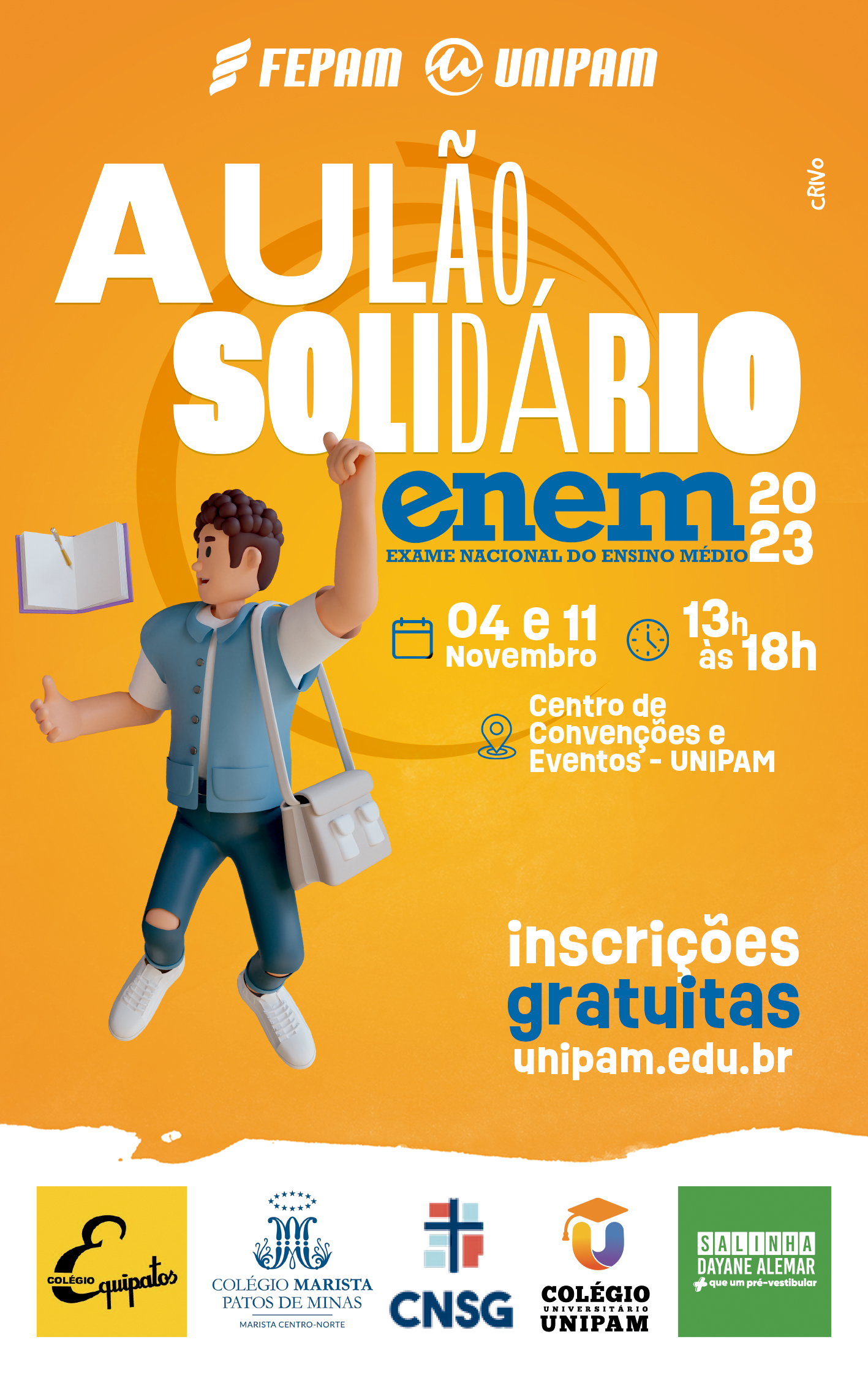 O Colégio Equipatos, o Colégio Marista, o Colégio Nossa Senhora das Graças, o Colégio Universitário UNIPAM e a Salinha Dayane Alemar promoverão, nos dias 04 e 11 de novembro, das 13h às 18h, no Centro de Convenções e Eventos (CCE) do Centro Universitário de Patos de Minas (UNIPAM), o “aulão solidário” em preparação ao Exame Nacional do Ensino Médio (Enem).