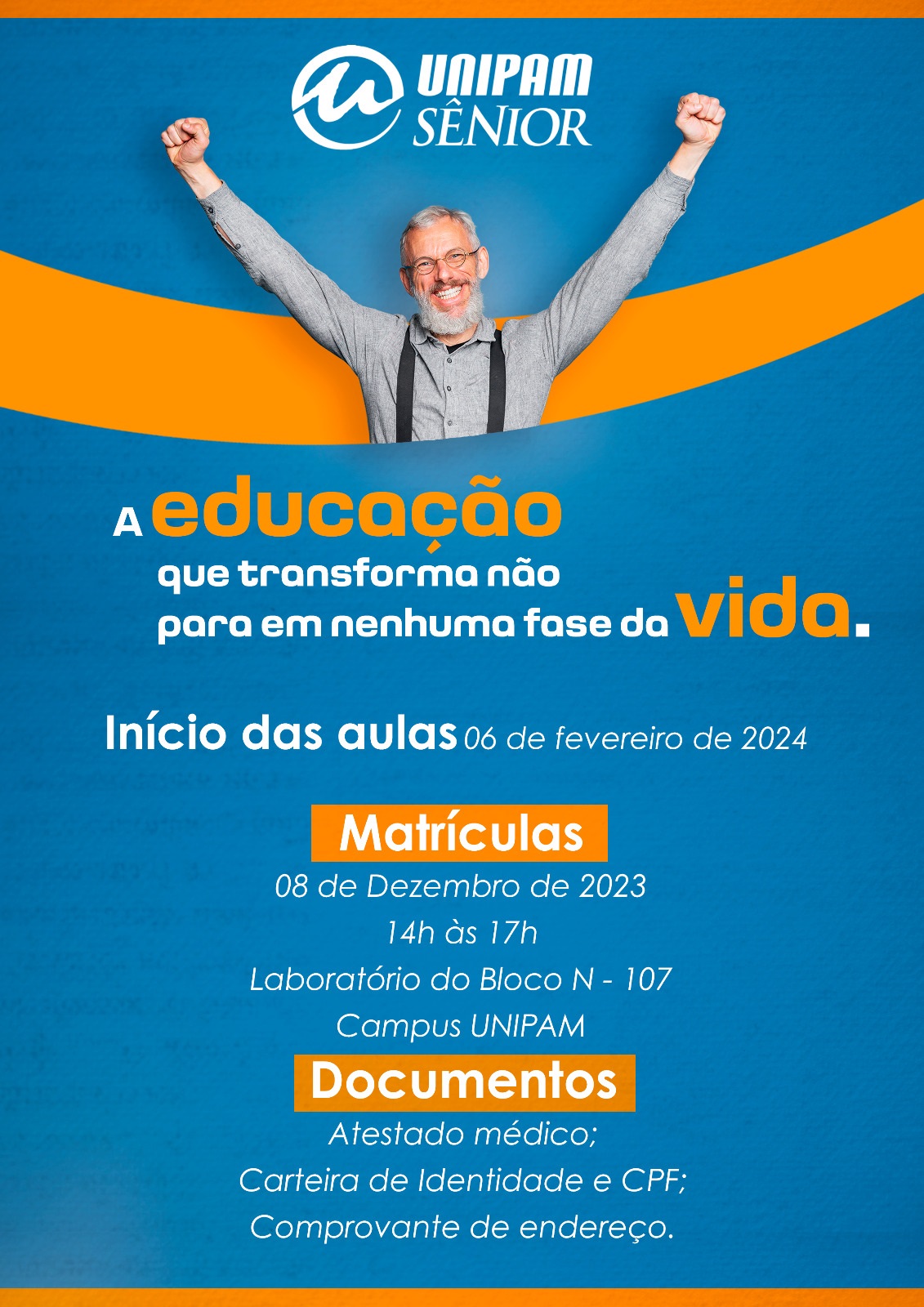 A Coordenação de Pós-Graduação, Pesquisa e Extensão do Centro Universitário de Patos de Minas (UNIPAM) realizará, no dia 08 de dezembro (sexta-feira), das 14h às 17h, na sala 107 do bloco N, as inscrições para o “Programa UNIPAM Sênior”. Posteriormente, as inscrições ocorrerão na Coordenação de Pós-Graduação, Pesquisa e Extensão.