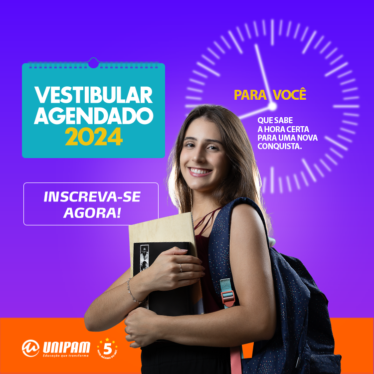 O Vestibular Agendado é a última oportunidade para aqueles que desejam ingressar em um curso de graduação, da modalidade presencial, ainda em 2024. O candidato deverá se inscrever pelo site https://vestibular.unipam.edu.br/ e escolher uma das opções disponíveis: prova on-line ou agendar o dia e horário para realizar a prova, presencialmente, no UNIPAM. As inscrições são gratuitas.