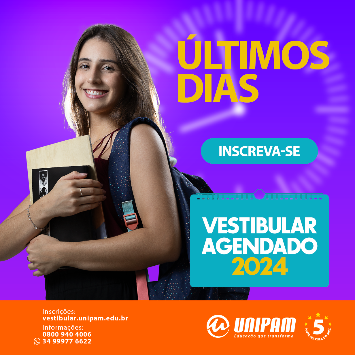 Estes são os últimos dias para se inscrever no Vestibular Agendado do Centro Universitário de Patos de Minas (UNIPAM), voltado para aqueles que desejam ingressar em um dos cursos de graduação, da modalidade presencial, em 2024. O processo está aberto para todos os cursos da instituição, exceto Medicina.