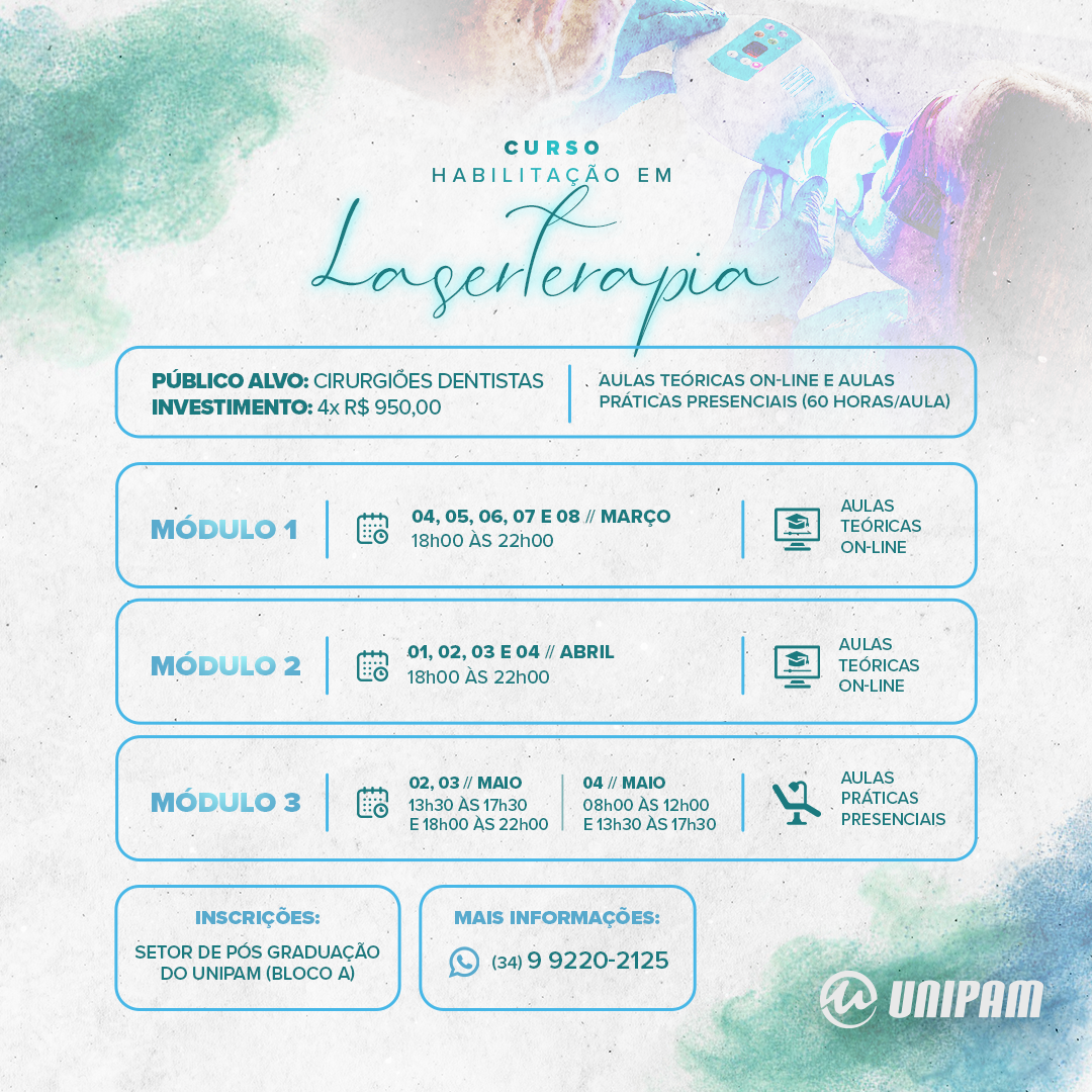 O Centro Universitário de Patos de Minas (UNIPAM), por meio do curso de Odontologia, promoverá de 04 de março a 04 de maio, nos formatos on-line e presencial, o curso “Habilitação em Laserterapia”. As aulas práticas serão ministradas no Centro Clínico Odontológico (CCO).