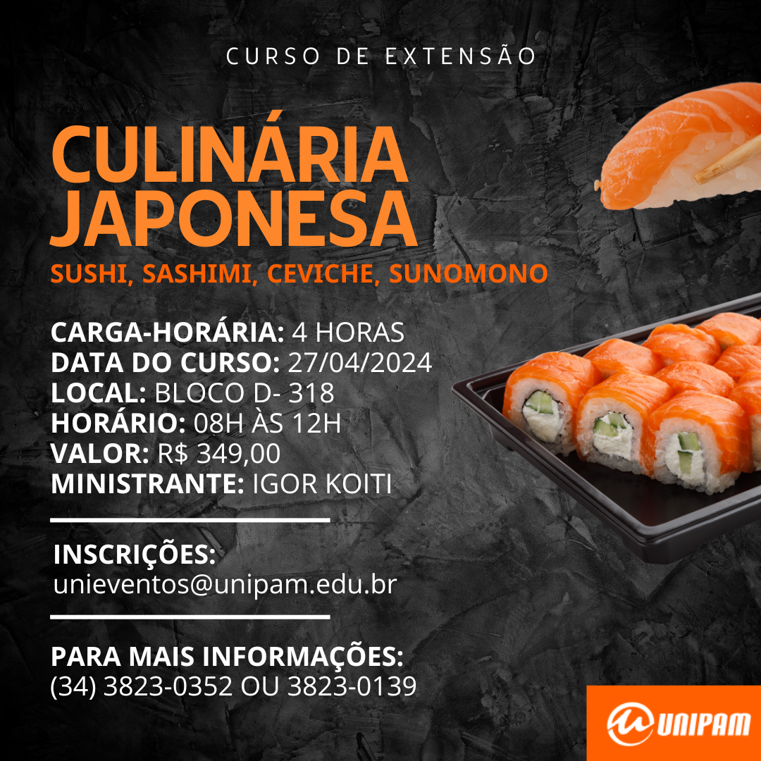 O Centro Universitário de Patos de Minas (UNIPAM) promoverá, no dia 27 de abril (sábado), das 8h às 12h, no bloco D, o curso “Culinária Japonesa”.