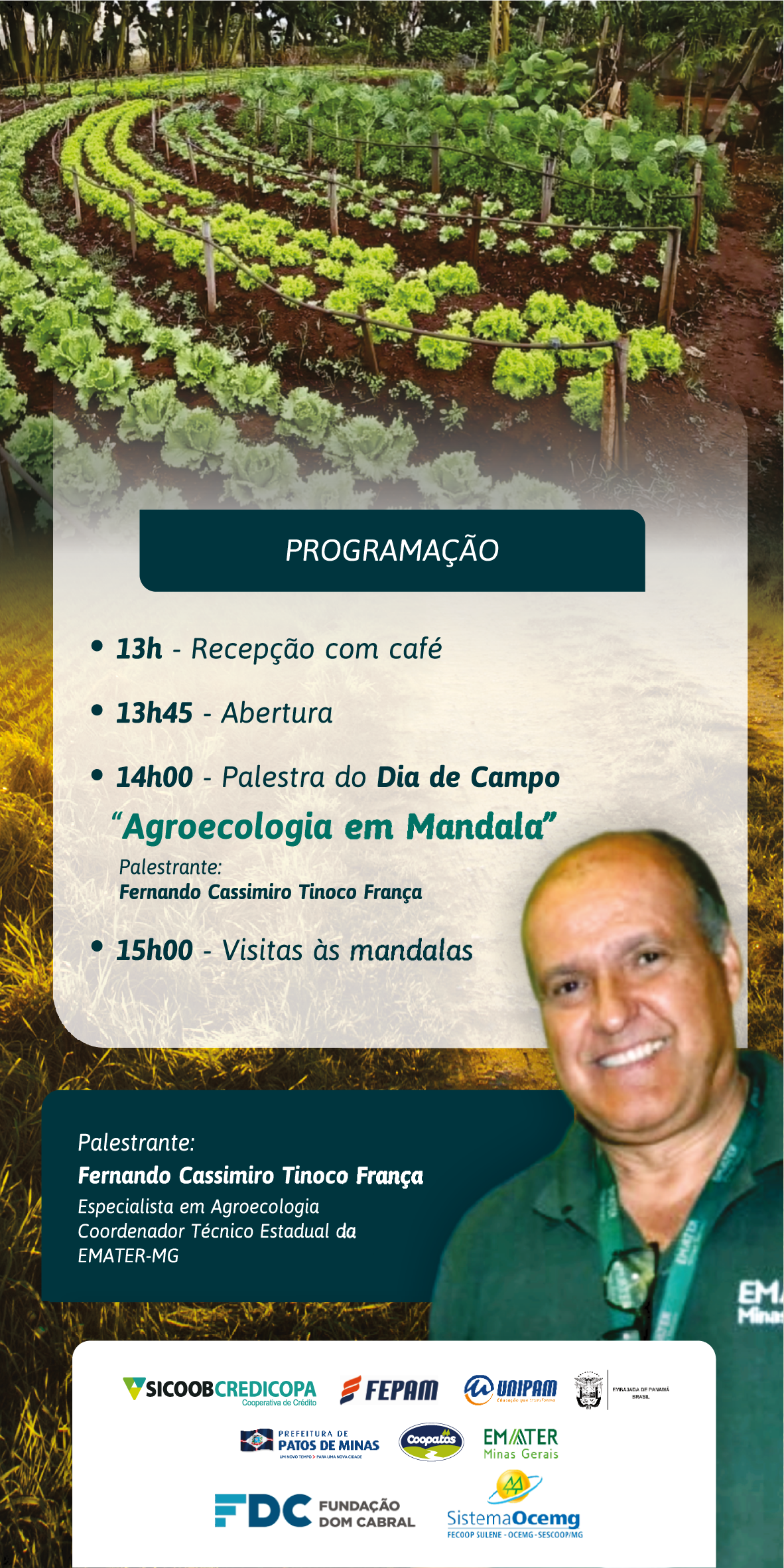 Durante o evento, será abordado o tema “Horticultura Agroecológica”. Na oportunidade, o coordenador técnico estadual da Empresa de Assistência Técnica e Extensão Rural do Estado de Minas Gerais (Emater) e especialista em agroecologia, Fernando Cassimiro Tinoco França, ministrará sobre “Agroecologia em Mandala”.