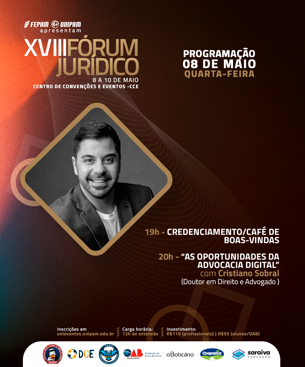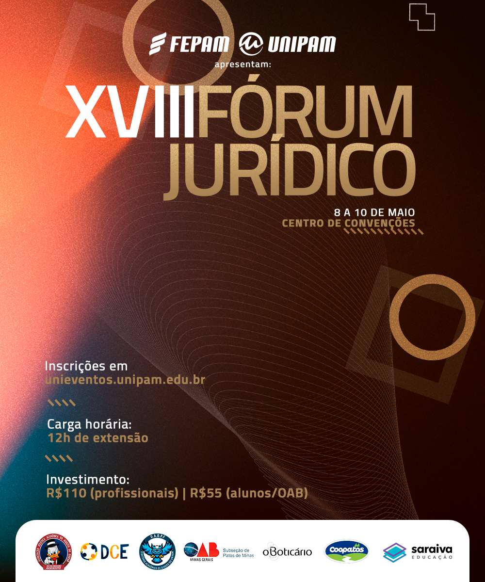 O curso de Direito do Centro Universitário de Patos de Minas (UNIPAM) promoverá, de 08 a 10 de maio, às 19h, no Centro de Convenções e Eventos (CCE), a XVIII edição do Fórum Jurídico.