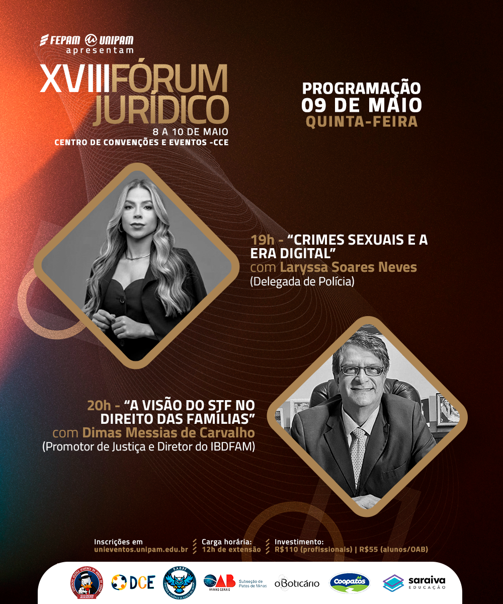 No segundo dia, 09 de maio (quinta-feira), às 19h, será ministrada a palestra “Crimes Sexuais e a Era Digital” com a delegada de polícia, Laryssa Soares Neves. Posteriormente, às 20h, ocorrerá a palestra “A Visão do STJ no Direito das Famílias” com o promotor de justiça e diretor do Instituto Brasileiro de Direito de Família (IBDFAM), Dimas Messias de Carvalho.