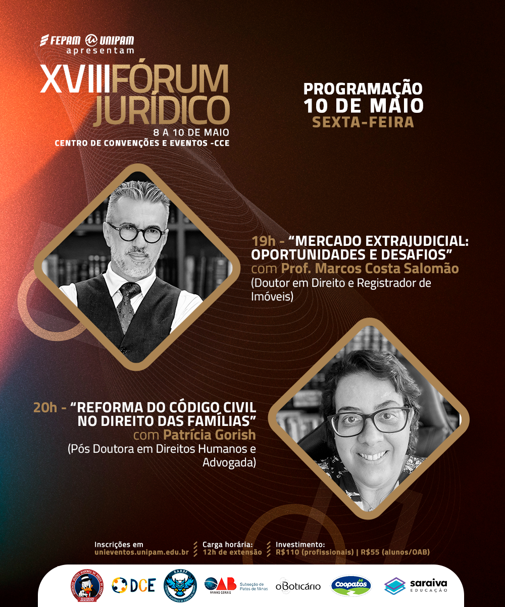 No terceiro e último dia, 10 de maio (sexta-feira), será promovida a palestra “Mercado Extrajudicial: Oportunidades e Desafios” com o doutor em direito e registrador de imóveis, Marcos Costa Salomão. Logo após, às 20h, será proferida a palestra “Reforma no Código Civil no Direito das Famílias” com a pós-doutora em direitos humanos e advogada, Patrícia Gorish.
