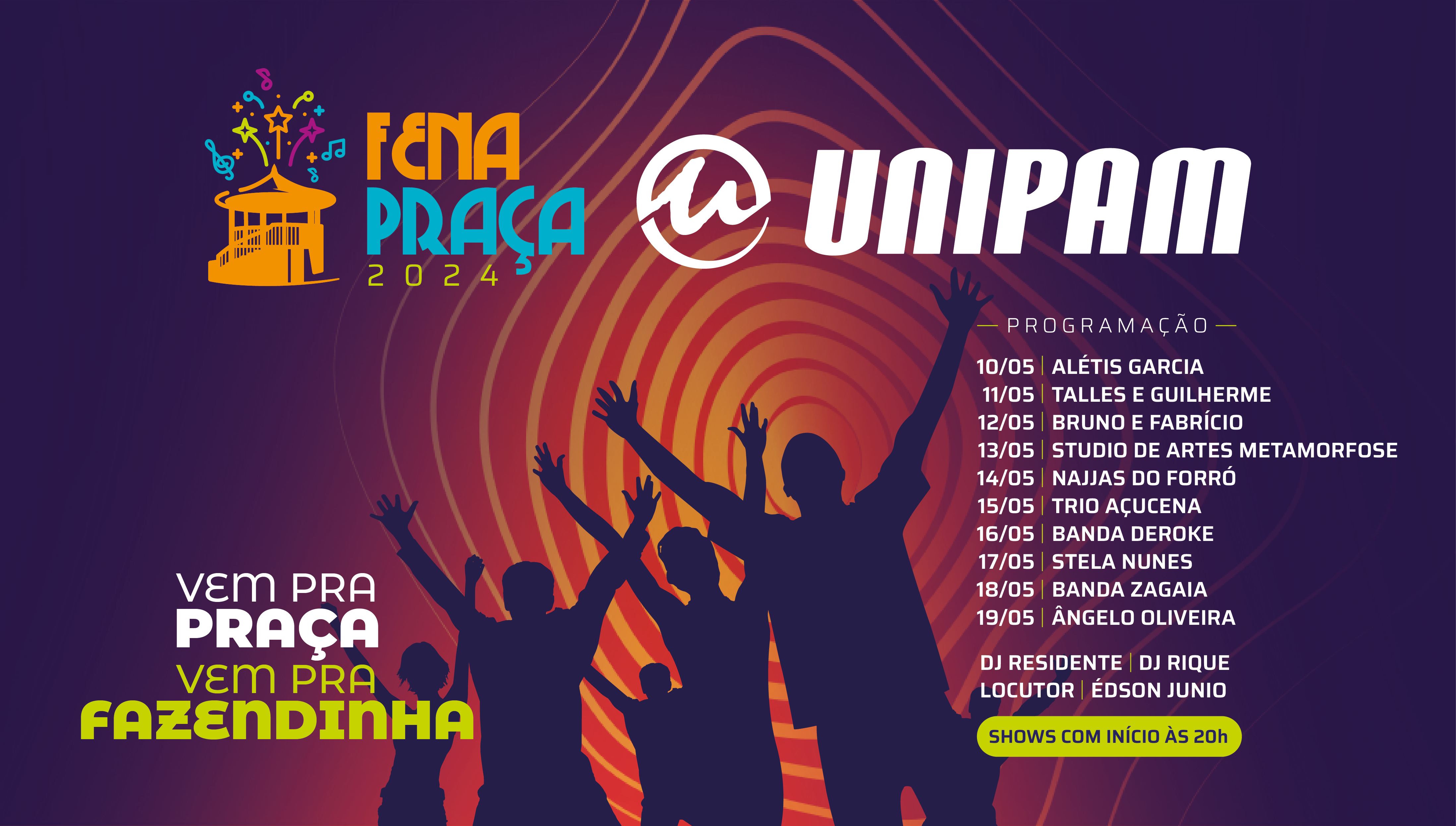O Centro Universitário de Patos de Minas (UNIPAM) é o patrocinador oficial dos shows da Fazendinha, na programação da Fenapraça 2024, que será realizada de 10 a 19 de maio. O espaço será montado na praça em frente à Catedral, localizada na Avenida Getúlio Vargas.