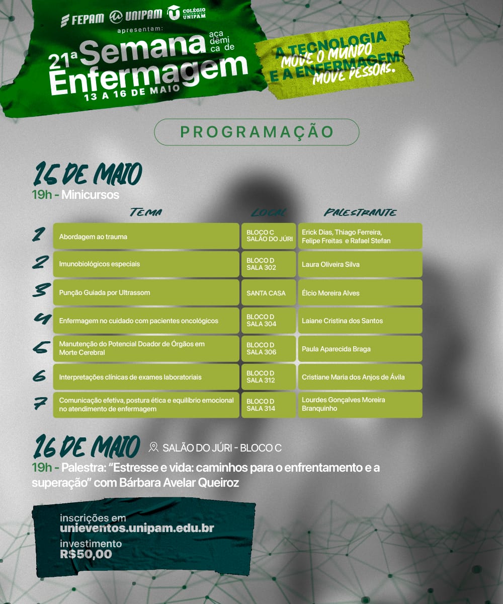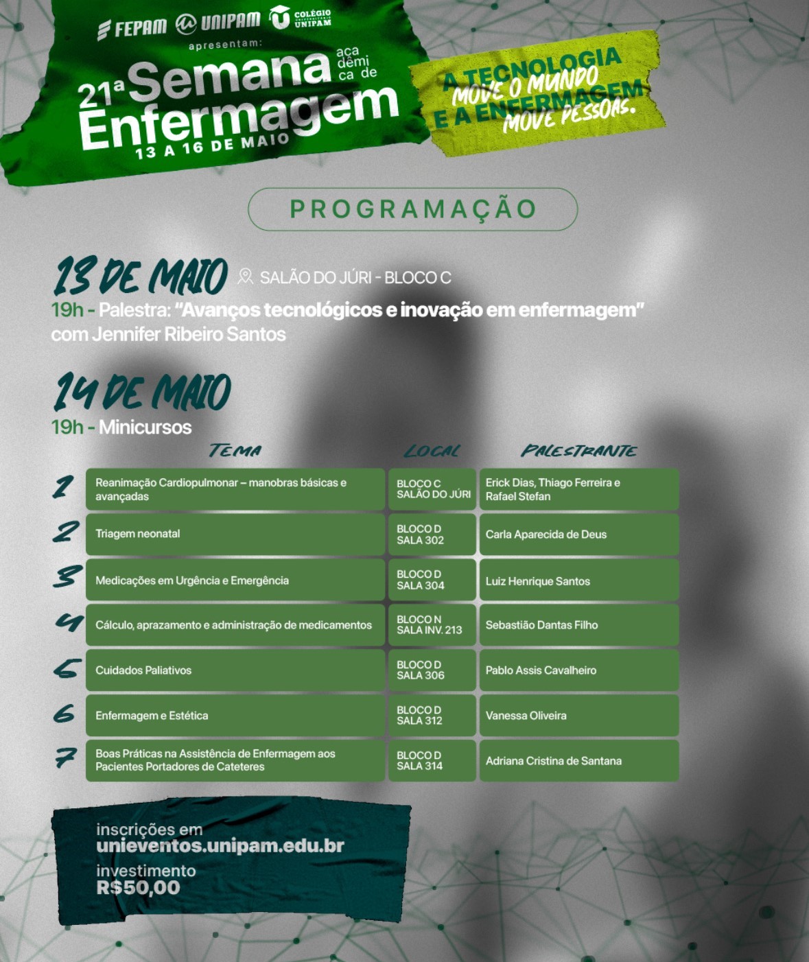 O curso de Enfermagem do Centro Universitário de Patos de Minas (UNIPAM) promoverá, de 13 a 16 de maio, no campus da instituição, a 21ª Semana Acadêmica de Enfermagem.