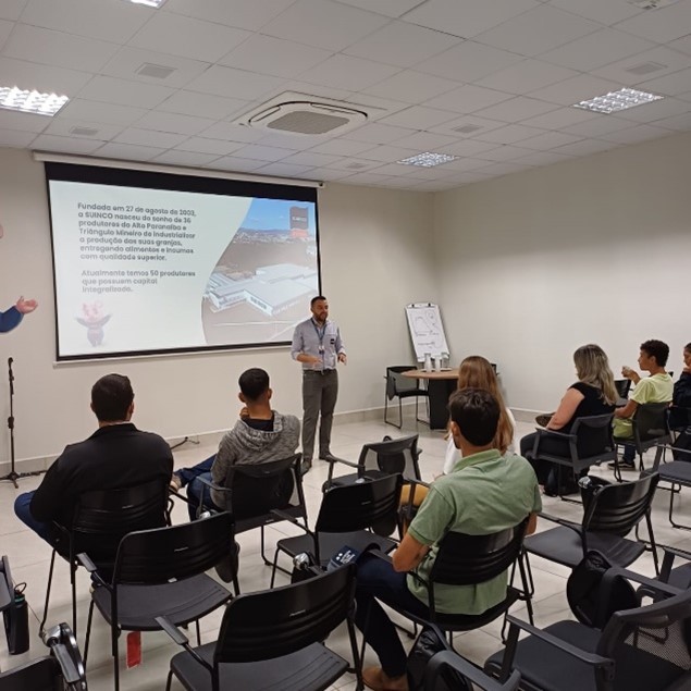 Durante a visita, os alunos tiveram um bate-papo com os gestores da cooperativa sobre gestão de insumos e de produção; gestão da qualidade e processos produtivos; marketing e comércio na cadeia de suínos; e gestão de logística. Além disso, eles conheceram um pouco da história da Suinco, seus produtos e as dependências da empresa.