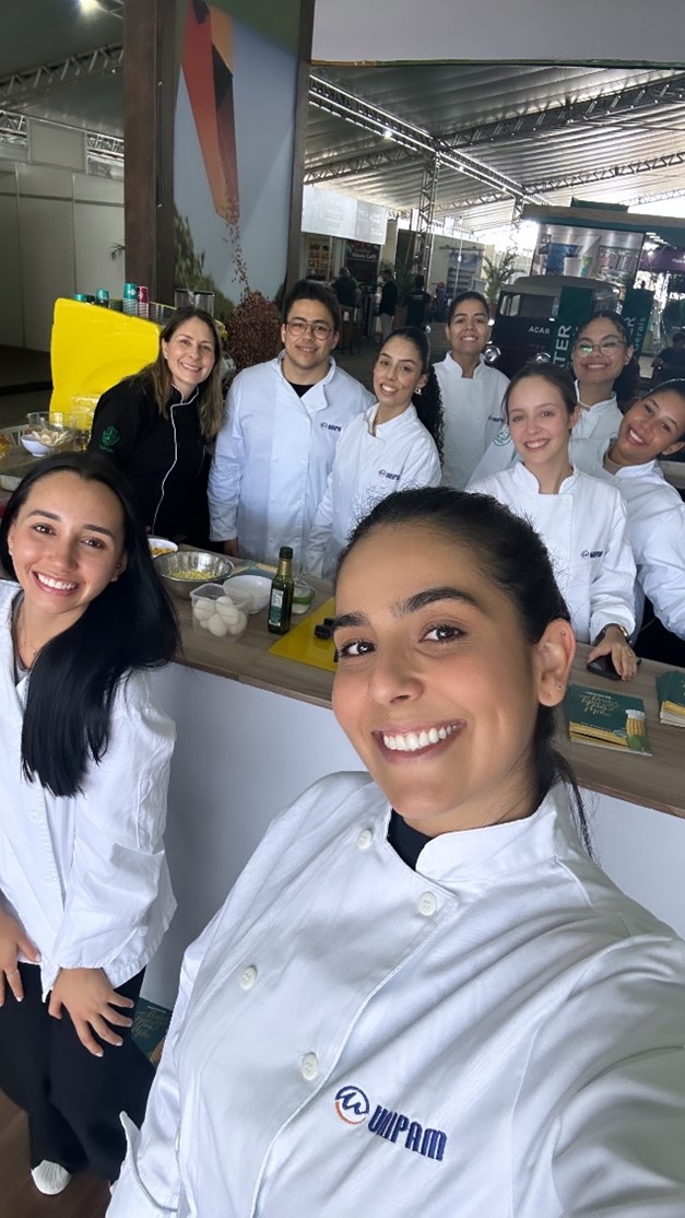 Alunos do curso de Nutrição do Centro Universitário de Patos de Minas (UNIPAM) ministraram, no dia 24 de maio (sexta-feira), sob supervisão da professora Karyna Maria de Mello Locatelli, uma aula no estande do SEBRAE, na Fenamilho Agro.