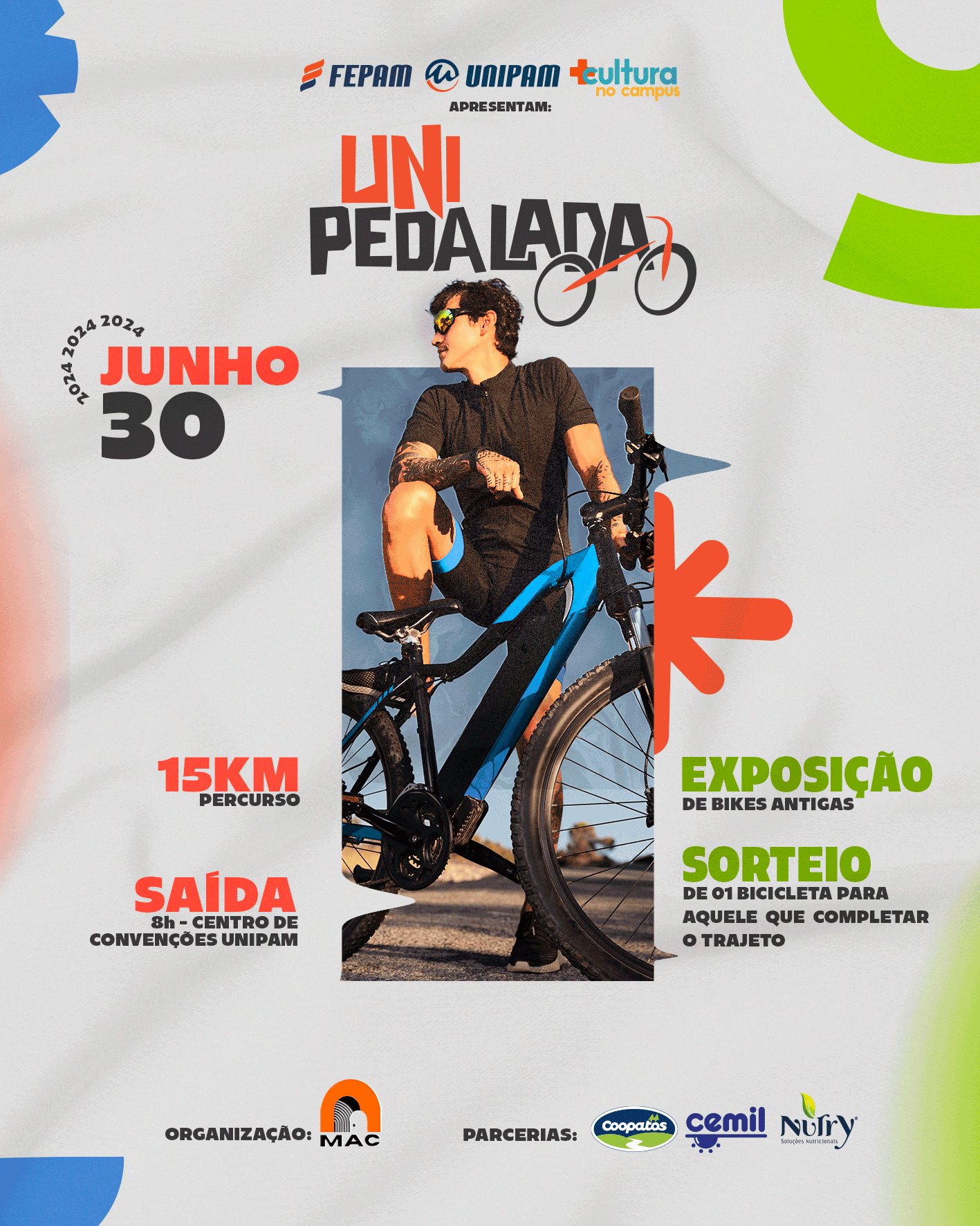A Fundação Educacional de Patos de Minas (FEPAM) e o Centro Universitário de Patos de Minas (UNIPAM), por meio do Projeto Mais Cultura no Campus, coordenado pela professora Regina Macedo, promoverão no dia 30 de junho (domingo), a 2ª edição da Unipedalada.