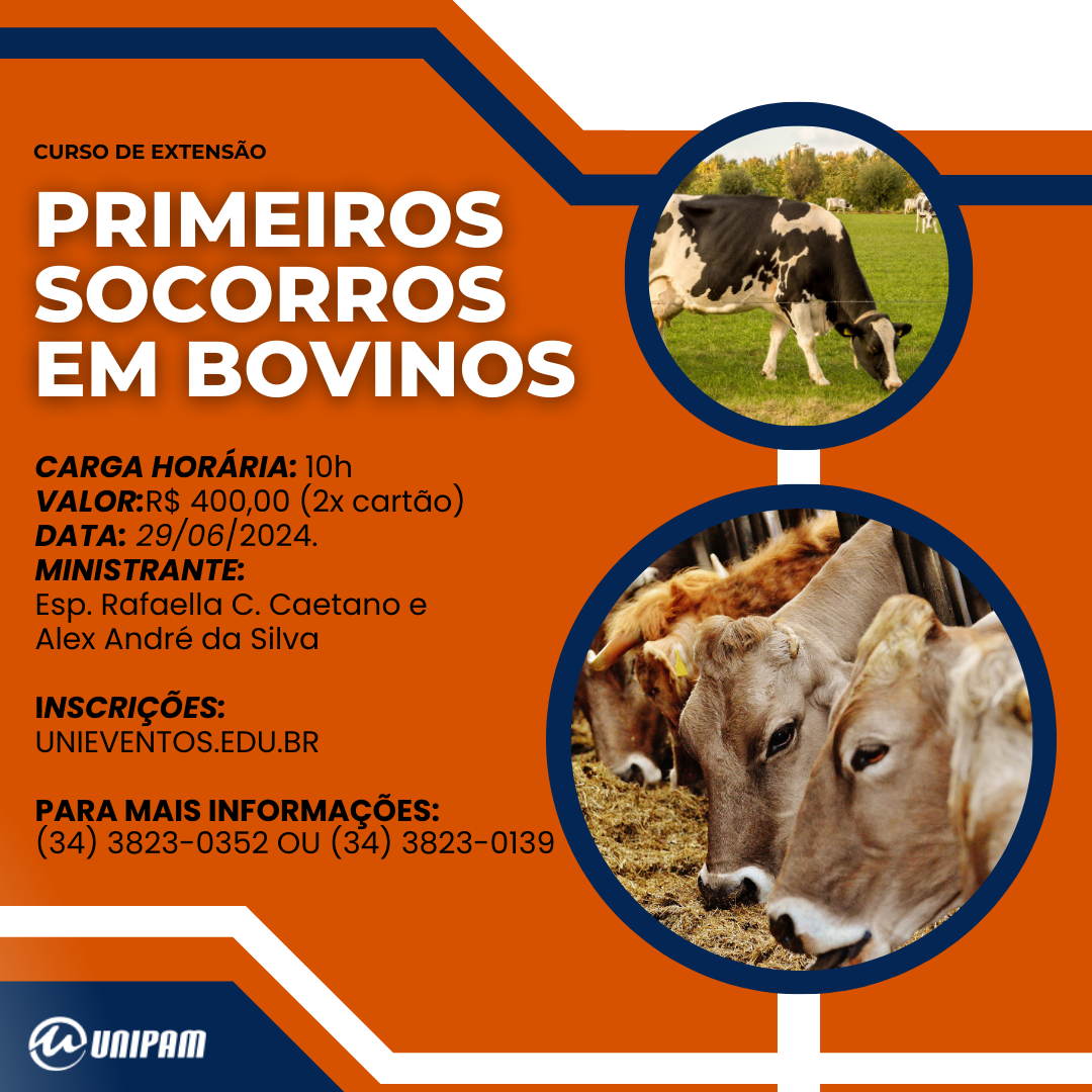 O Centro Universitário de Patos de Minas (UNIPAM) promoverá, no dia 29 de junho (sábado), a partir das 7h, no Centro Clínico Veterinário (CCV), o curso “Primeiros Socorros em Bovinos”.