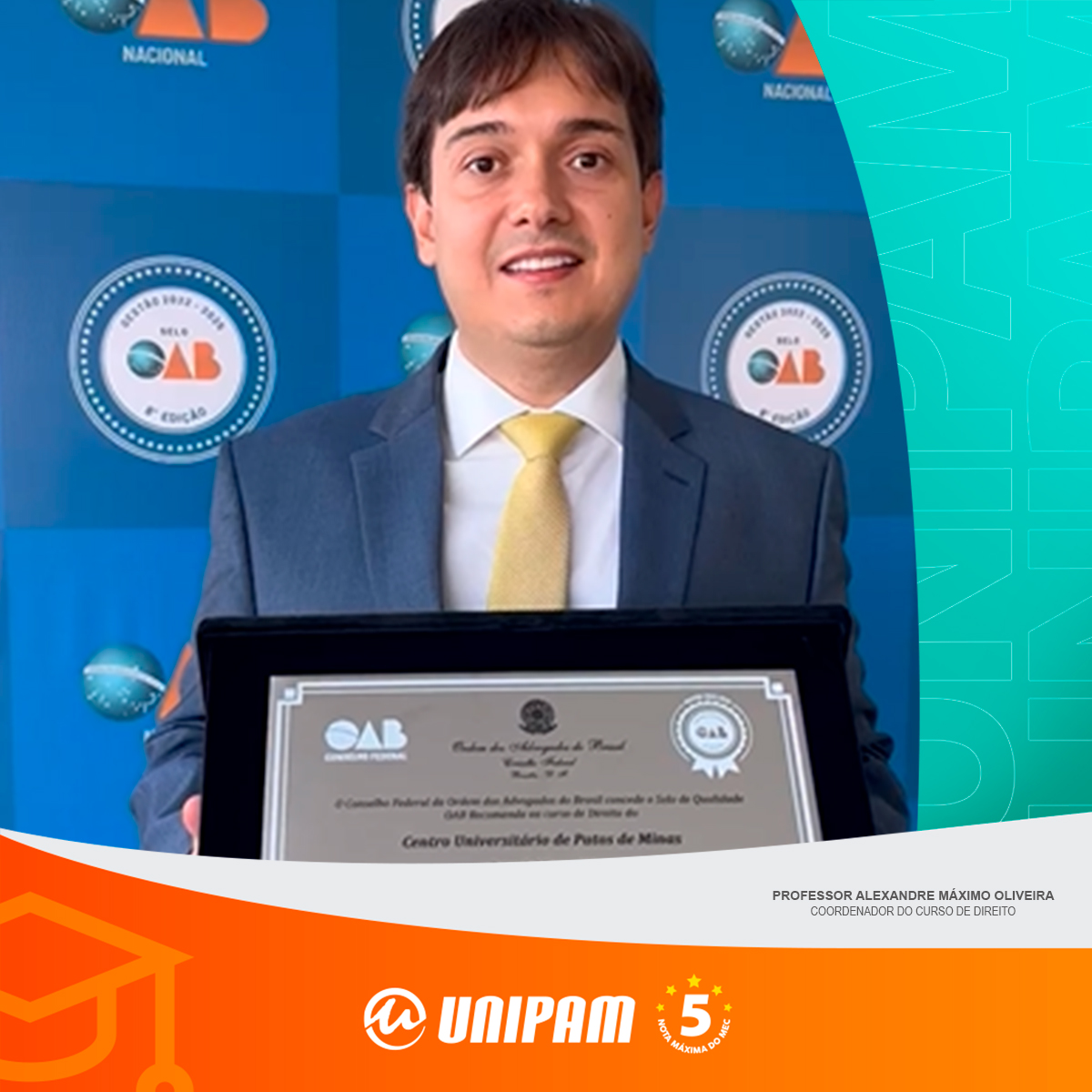 O curso de Direito do Centro Universitário de Patos de Minas (UNIPAM) recebeu, no dia 19 de junho (quarta-feira), o Selo de Qualidade OAB Recomenda. A cerimônia foi realizada na sede do Conselho Federal da Ordem dos Advogados do Brasil (CFOAB), em Brasília (DF).