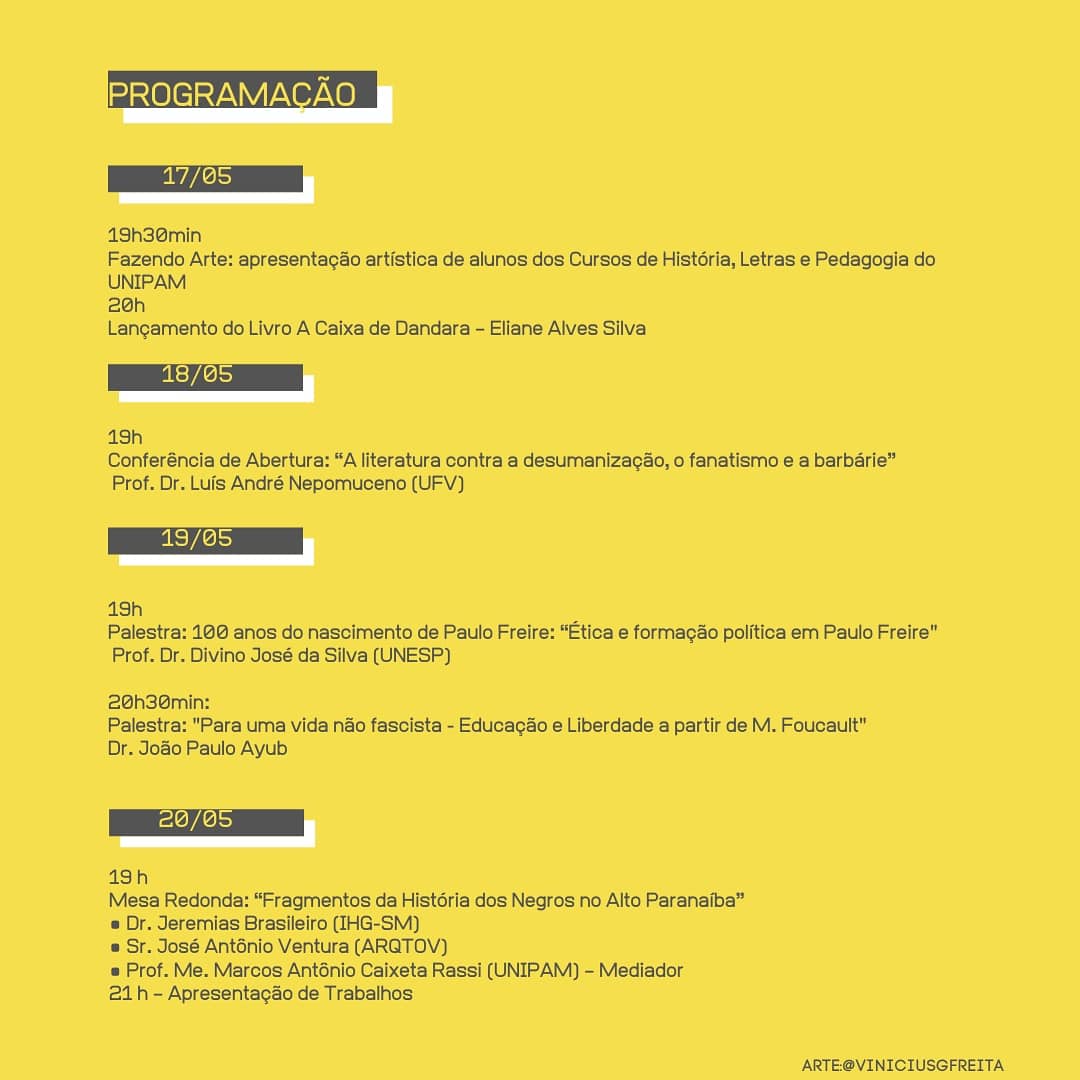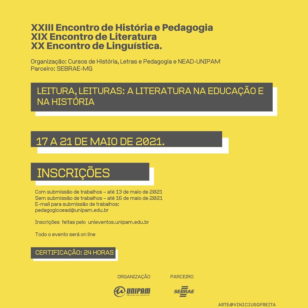 O Centro Universitário de Patos de Minas (UNIPAM), por meio dos cursos de História, de Letras e de Pedagogia e do Núcleo de Educação a Distância (NEAD), promoverá de 17 a 21 de maio, o XXIII Encontro de História e Pedagogia, o XIX Encontro de Literatura e o XX Encontro de Linguística. O evento será realizado em formato on-line.