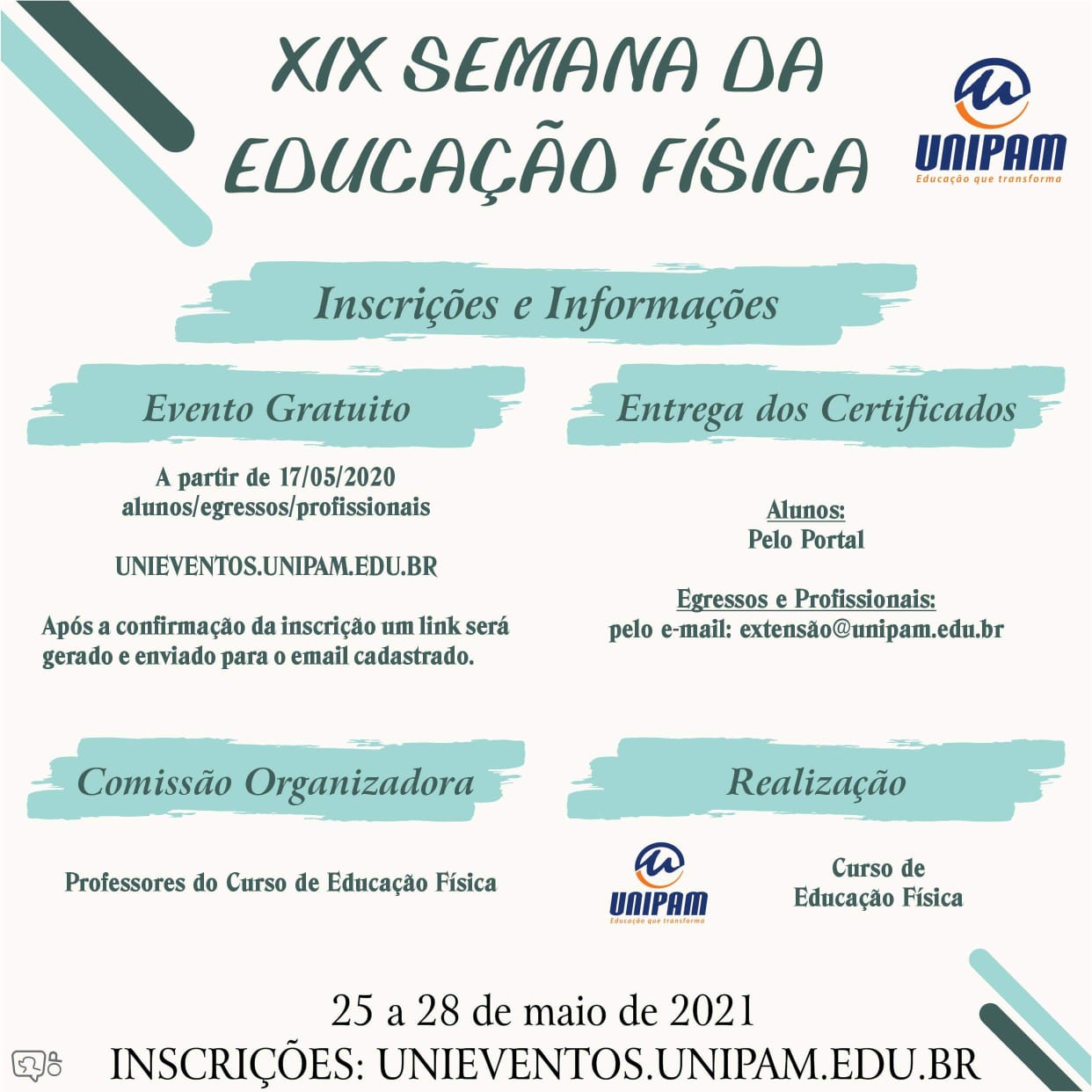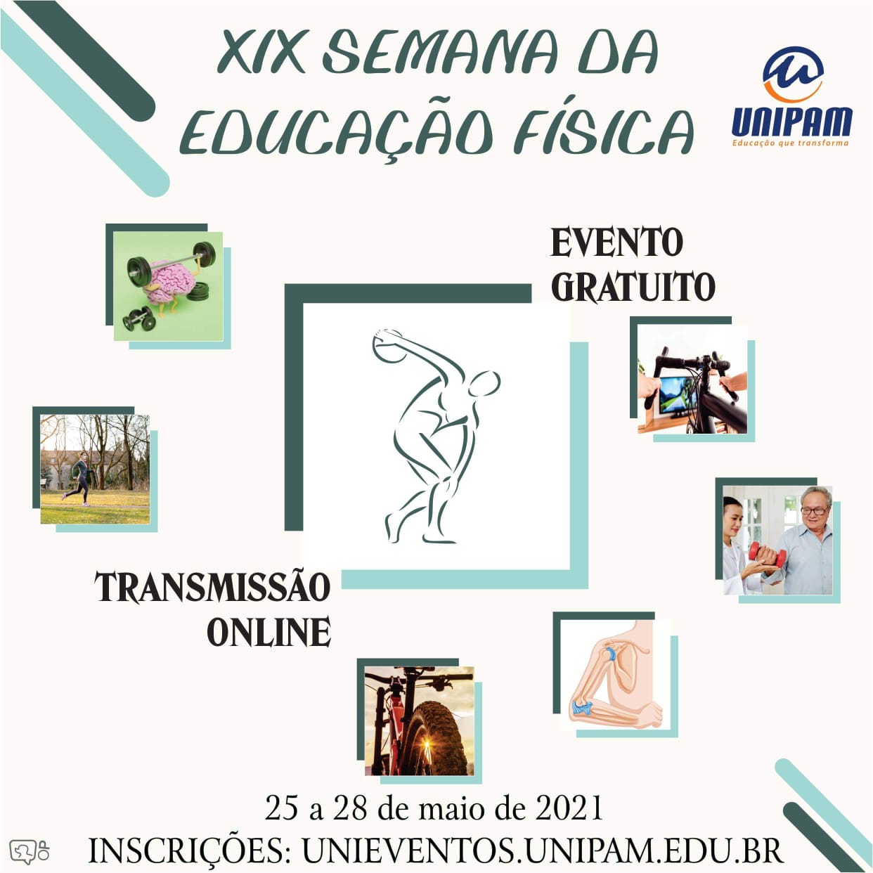 O curso de Educação Física do Centro Universitário de Patos de Minas (UNIPAM) promoverá de 25 a 28 de maio, a XIX Semana da Educação Física. O evento ocorrerá de maneira on-line, por meio do canal do curso, no YouTube. A semana contará com palestras e mesas redondas.