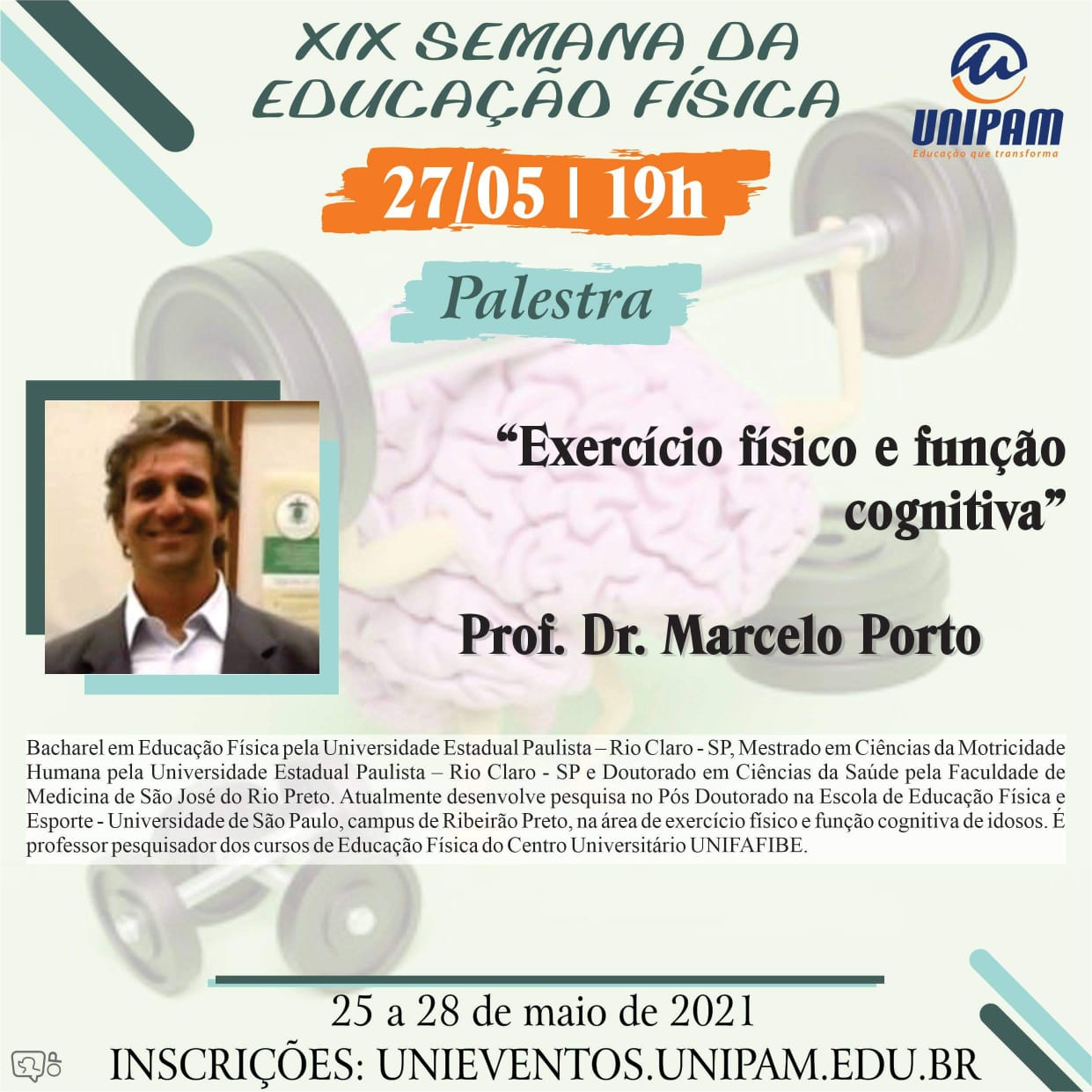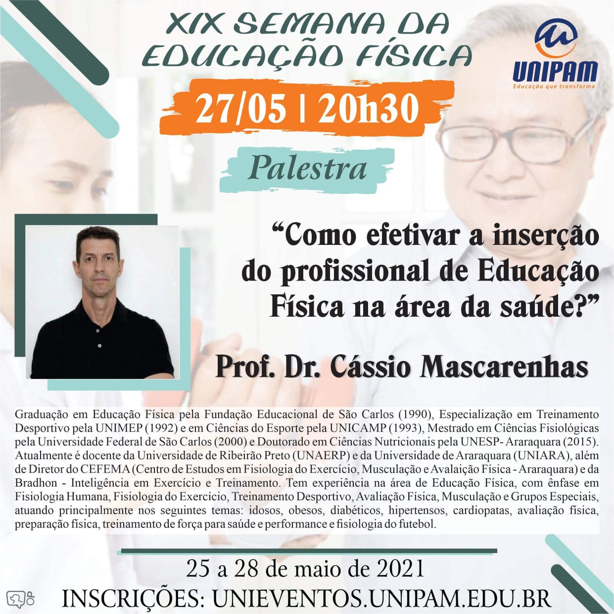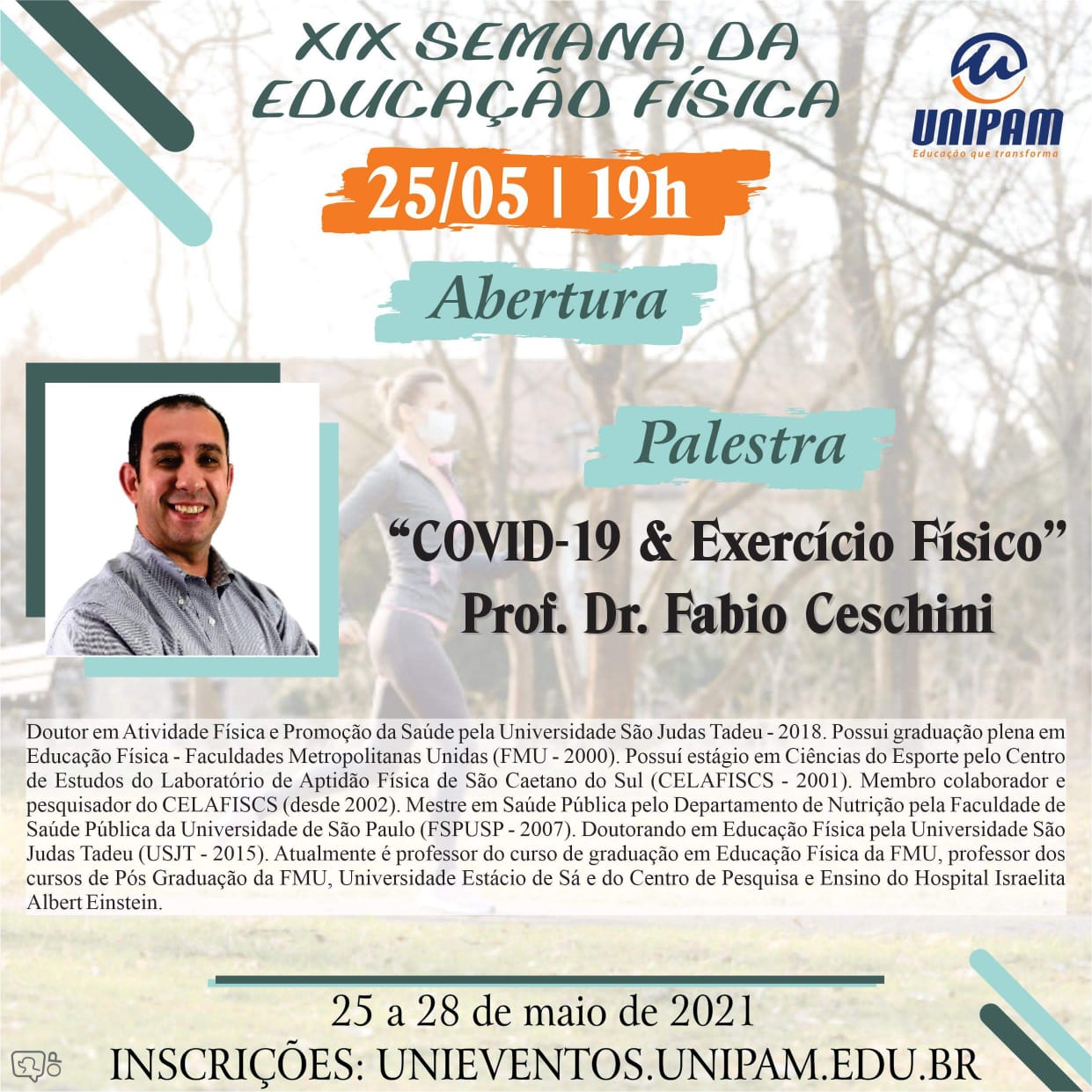 A palestra de abertura, intitulada “COVID-19 e Exercício Físico” será ministrada terça-feira (25), às 19h, pelo Doutor em Atividade Física e Promoção da Saúde, Fabio Ceschini.