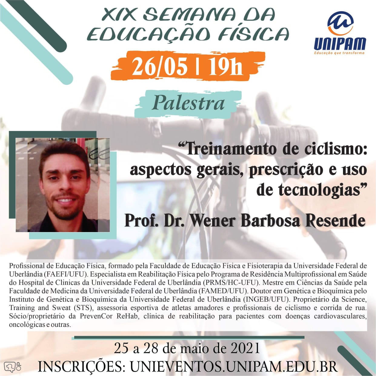 No segundo dia do evento, quarta-feira (26), às 19h, ocorrerá a palestra “Treinamento de Ciclismo: Aspectos Gerais, Prescrição e Uso de Tecnologias”, proferida pelo Doutor em Genética e Bioquímica, Wener Barbosa Resende. Posteriormente, às 20h30, acontecerá uma mesa redonda com os atletas: Bruno César, Henrique Amaro e Marden Braz.
