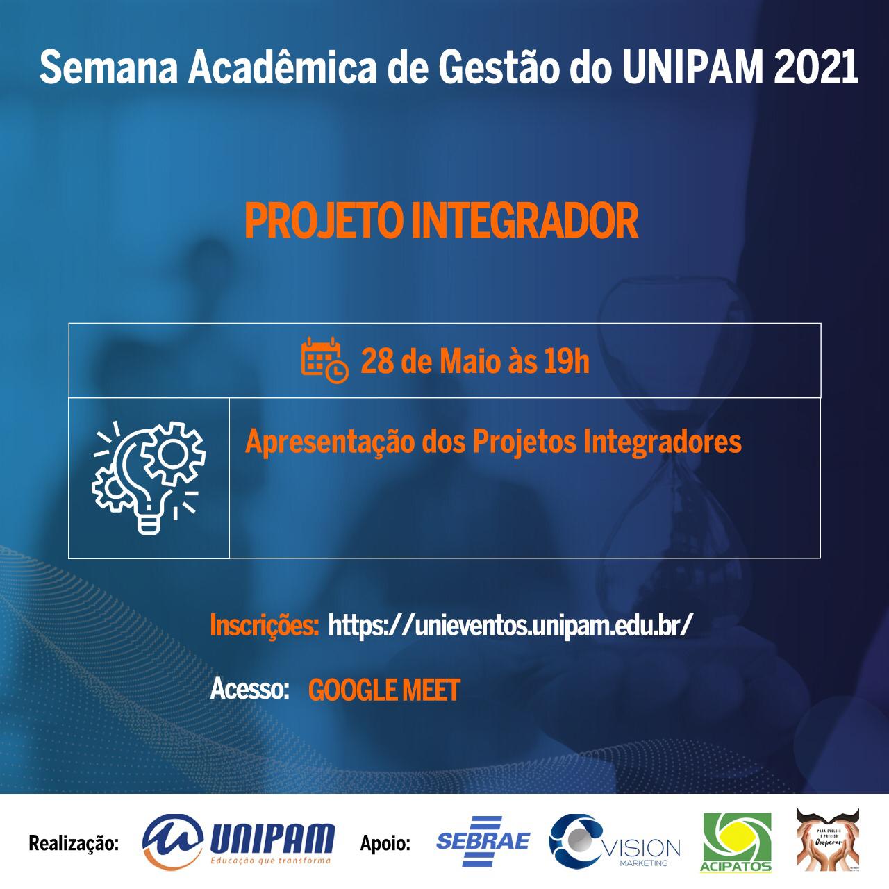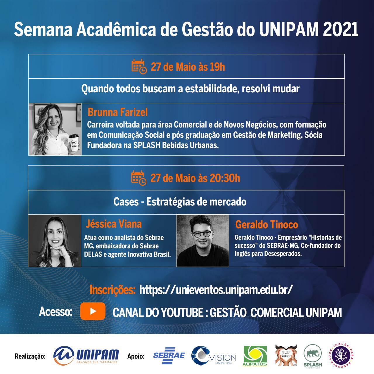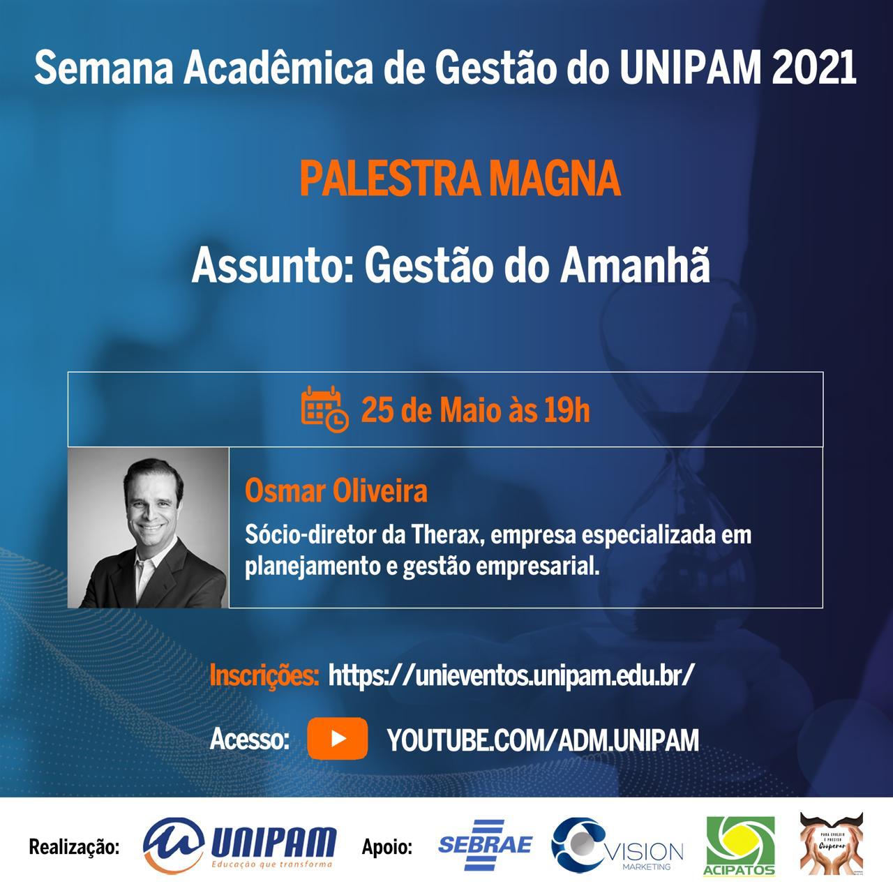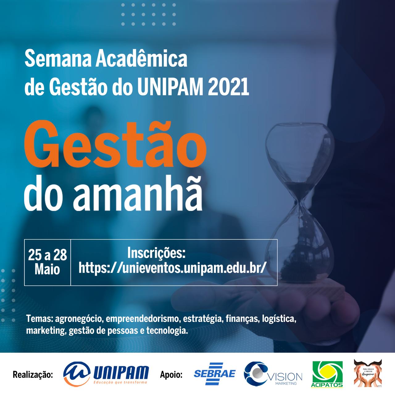 O Centro Universitário de Patos de Minas (UNIPAM), promoverá de 25 a 28 de maio, por meio do canal do curso de Administração, no YouTube, a Semana Acadêmica de Gestão.